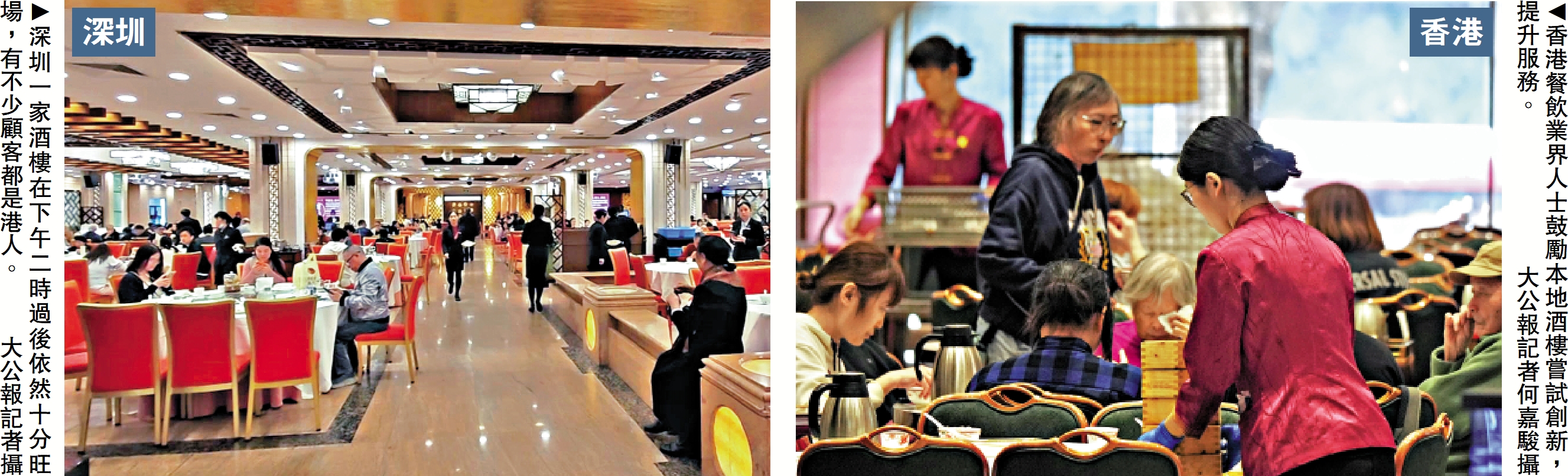 大公報記者早前到深圳多間港式酒樓觀察,發現普遍座無虛席。有酒樓經理表示,周末到來光顧的港人確實越來越多,免收服務費、點心款式多、加上輪流推出專供「打卡」拍照的精緻食品,迎合港人喜歡「打卡」的潮流。有餐飲業界人士認為,本地酒樓應擺脫現時「鬥平」的求存方法,創造特色,否則便難以留客。有經濟學者分析,隨着本地舖租逐漸回落,中式酒樓今年結業情況或會有好轉。\大公報記者 伍軒沛、陳泓源