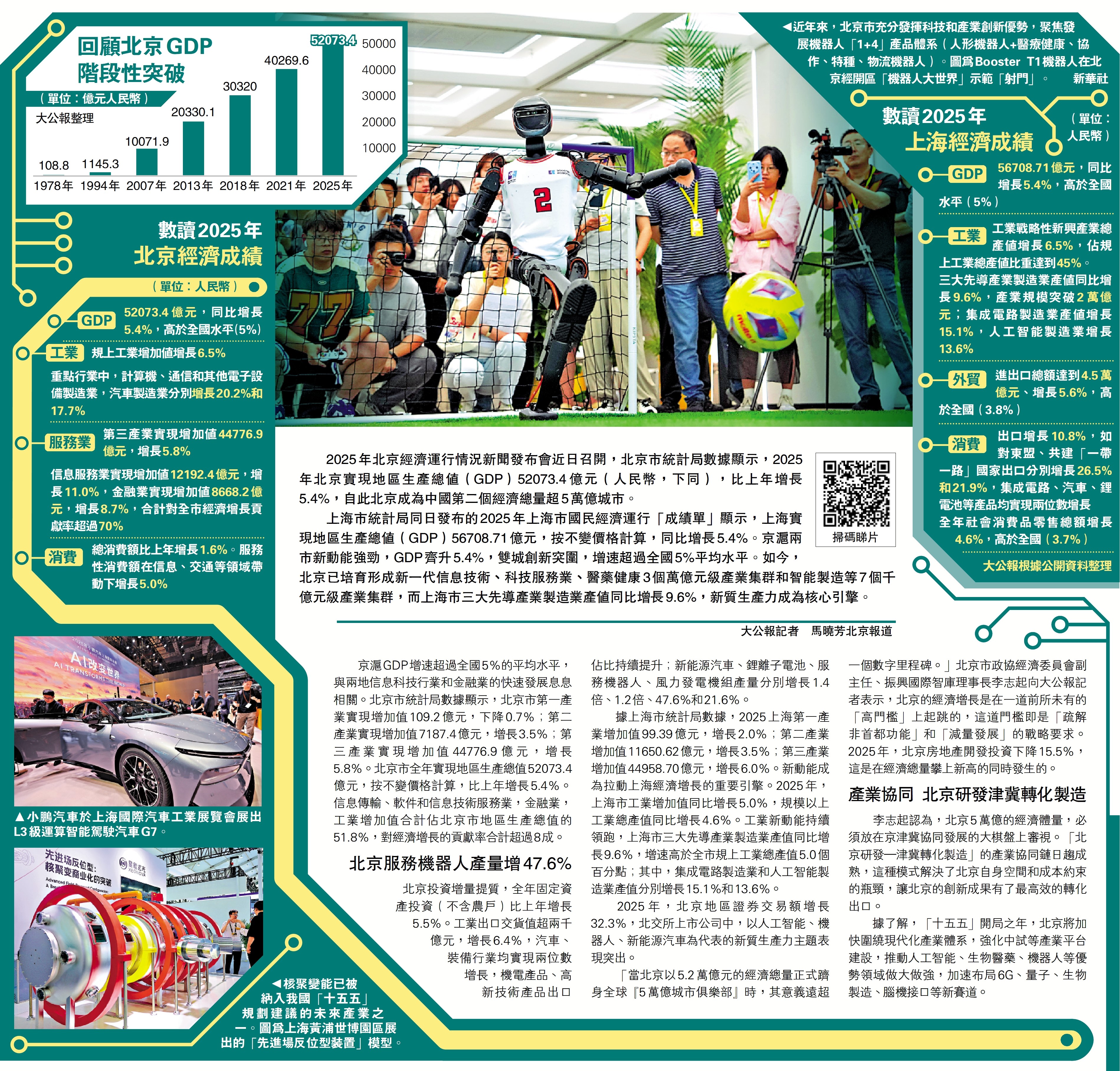 上海市統計局同日發布的2025年上海市國民經濟運行「成績單」顯示,上海實現地區生產總值(GDP)56708.71億元,按不變價格計算,同比增長5.4%。京滬兩市新動能強勁,GDP齊升5.4%,雙城創新突圍,增速超過全國5%平均水平。如今,北京已培育形成新一代信息技術、科技服務業、醫藥健康3個萬億元級產業集群和智能製造等7個千億元級產業集群,而上海市三大先導產業製造業產值同比增長9.6%,新質生產力成為核心引擎。\大公報記者 馬曉芳北京報道