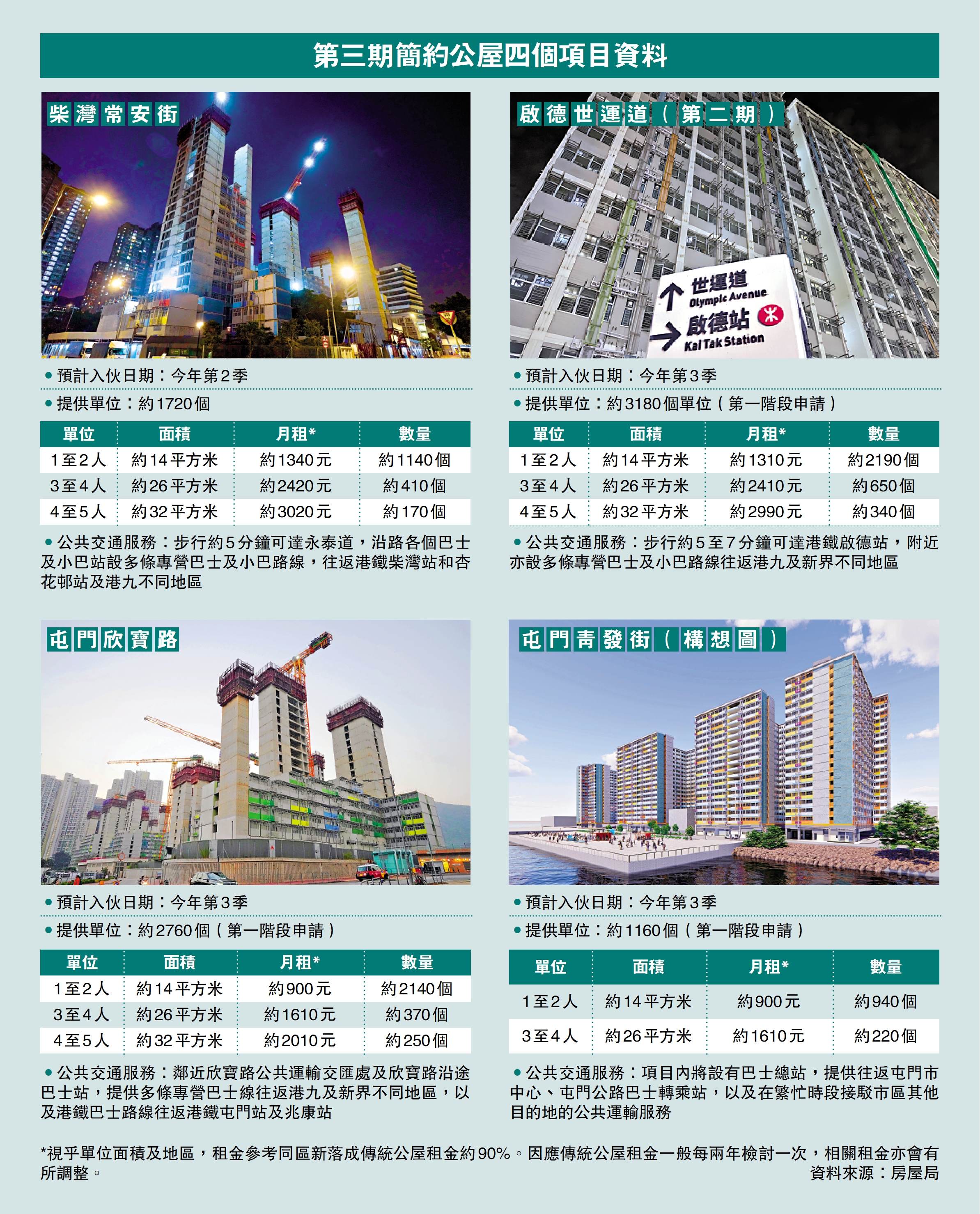 今次接受申請的是第三期簡約公屋,柴灣常安街項目是唯一位於港島的簡約公屋;啟德世運道(第二期)項目與港鐵啟德站的步行距離只約5至7分鐘,而且屬於被稱為「四大校網」之一的34小一學校網。柴灣常安街項目預計於今年第二季開始入伙,其餘三個項目預計於今年第三季入伙。(見表)