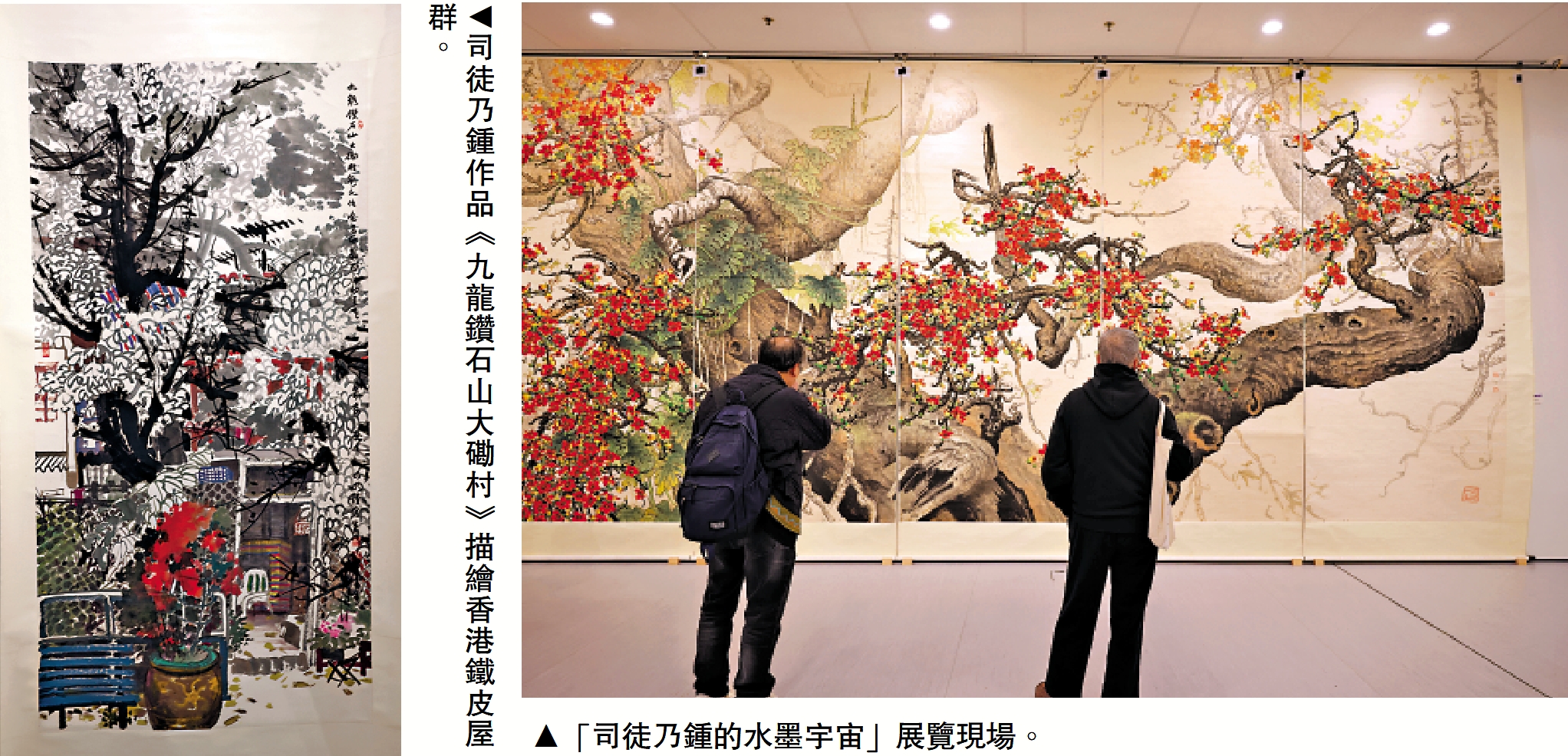 正在香港中央圖書館展覽廳舉行的「司徒乃鍾的水墨宇宙」,從五百多件司徒乃鍾的創作中精選出逾百件,橫跨司徒乃鍾六十多年的創作歷程。展覽於日前舉行開幕式,司徒乃鍾笑言,展覽名字來自策展人鄧海超,「因為我的畫太大、題材太廣,要誇張地說,它就像一個宇宙」。在這個自由而開放的宇宙裏,司徒乃鍾的創作題材,既有花鳥、山水,也有香港城市風景與歷史題材;從寫生到想像,從傳統水墨到現代藝術語言,他不設界線。/大公報記者 郭悅盈(文、圖)