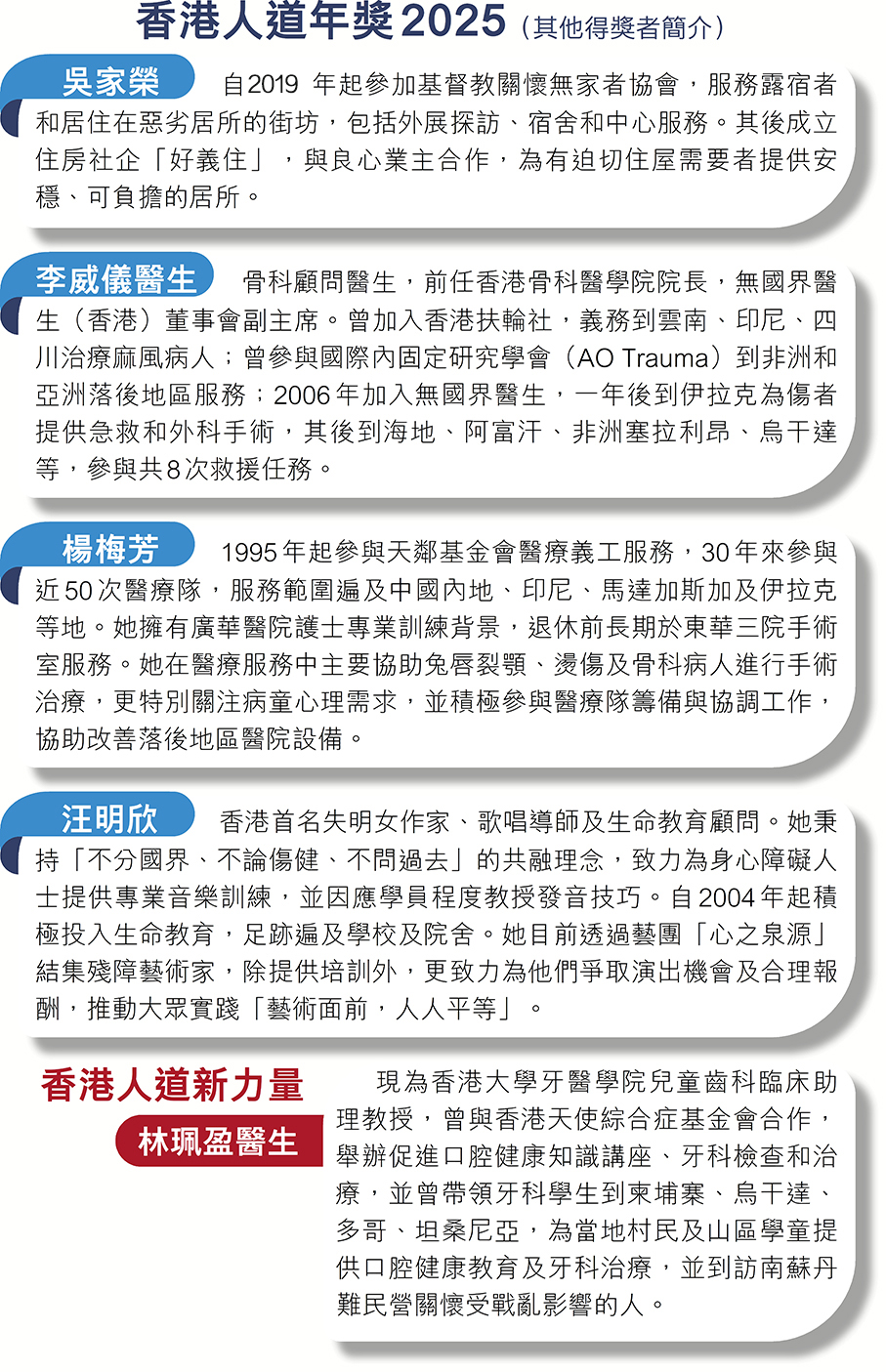 香港紅十字會昨日公布本年度「香港人道年獎」得獎名單,其中8人獲頒「香港人道年獎」,另一人獲「香港人道新力量」。他們分別來自不同界別,包括深入伊拉克、加沙等戰地救援的醫護人員,以及在本港服務無家者、長者、特殊兒童等社群的傑出人士,彰顯人道精神無分地域。