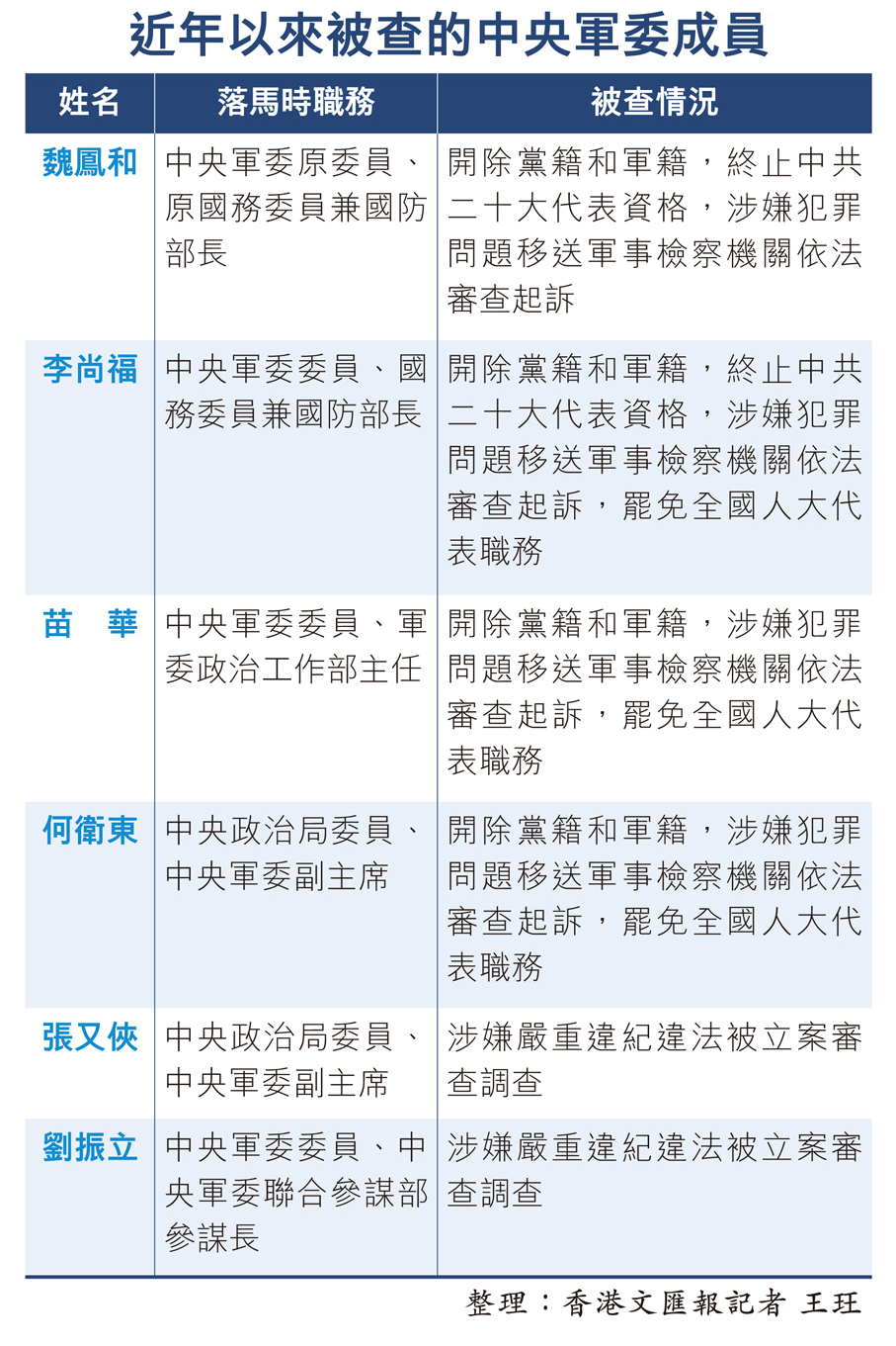 據悉,2022年10月23日中共二十屆一中全會決定的中央軍事委員會組成人員中,中央軍委副主席張又俠、何衛東,中央軍委委員李尚福、劉振立、苗華已經落馬。另據香港文匯報記者不完全統計,近年來已有近30名解放軍將領落馬,僅去年宣布被查的上將就有11人。
