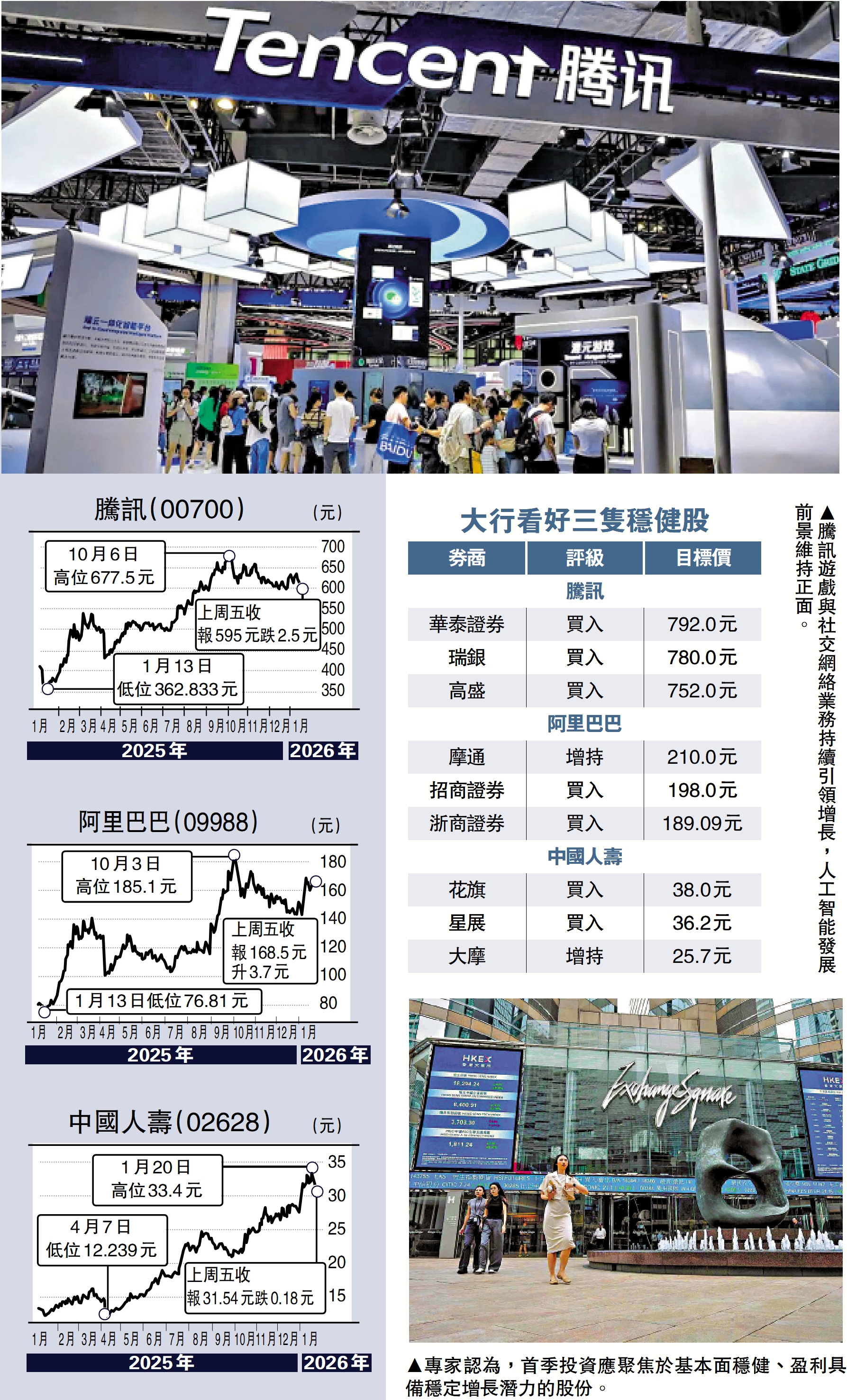 在地緣政治風險加劇── 包括美國對委內瑞拉的侵略、中東局勢持續升溫,以及美國降息進程尚不明朗的背景下,光大證券國際策略師伍禮賢指出,本季投資應聚焦於基本面穩健、盈利具備穩定增長潛力的股份,其中騰訊(00700)及中國人壽(02628)均符合上述條件,值得重點關注。永豐證券則建議在首季初期採取「逢低布局、結構優化」策略,把握具較高增長潛力的板塊回調機會,尤其關注「新質生產力」相關領域,如智慧科技與新能源。\大公報記者 李永青