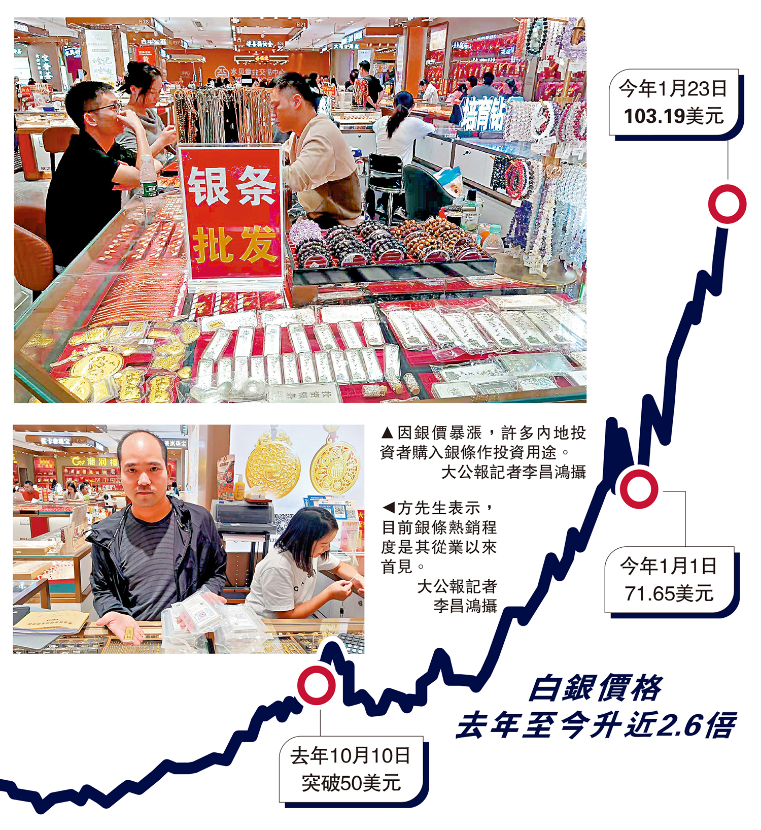 銀條入場門檻遠低於金條,加上「買漲不買跌」心態,銀價上升無阻內地投資者入市熱情。深圳水貝黃金交易中心一商家鼎禎黃金負責人方先生昨日向記者透露,因看好銀價前景,有投資者一次過購入80公斤銀條和銀板,並現場給他轉賬200萬元(人民幣,下同)。該投資者表示,先將銀條和銀板收藏起來,待未來價格上漲四五成甚至一倍後便會轉手。\大公報記者 李昌鴻深圳報道