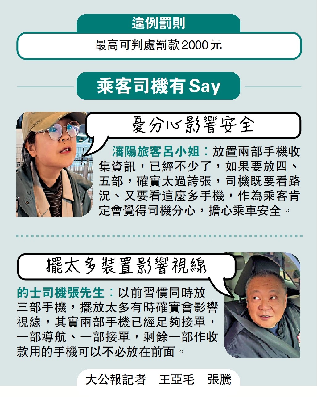 的士司機張先生:以前習慣同時放三部手機,擺放太多有時確實會影響視線,其實兩部手機已經足夠接單,一部導航、一部接單,剩餘一部作收款用的手機可以不必放在前面。