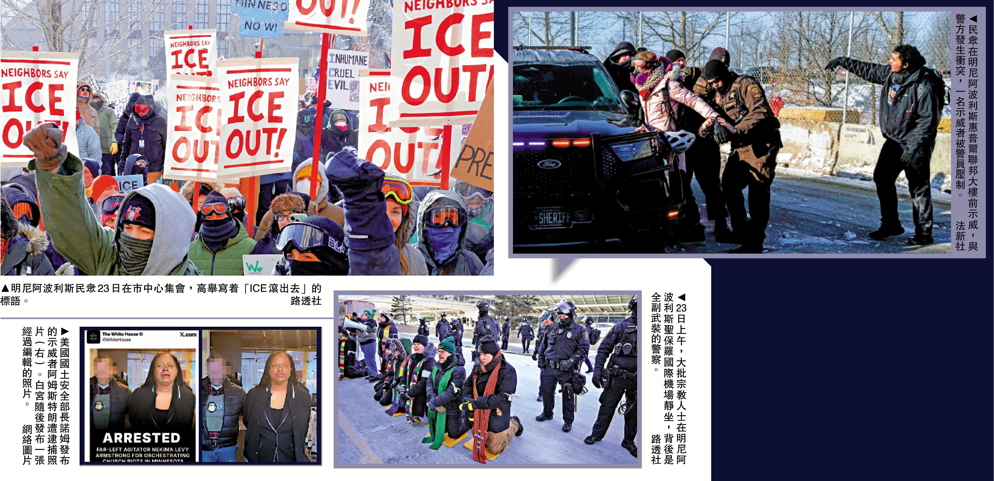 面對民眾強烈反彈,聯邦政府則擺出強硬姿態。國土安全部發言人抨擊示威者企圖癱瘓經濟。美國國土安全部長諾姆22日在社交平台X上發布一張在明尼蘇達州遭逮捕的示威者阿姆斯特朗的照片,約半小時後,白宮官方賬號發布了一張「類似」圖片,但身為黑人的阿姆斯特朗皮膚被明顯加深,臉上被添加了清晰的淚痕,呈現出哭泣、痛苦的表情。輿論批評這是利用虛假信息進行政治宣傳,白宮方面將此圖稱為「迷因」。分析指出,近期ICE執法行動,將進一步加劇了美國國內的政治對立和民意撕裂。
