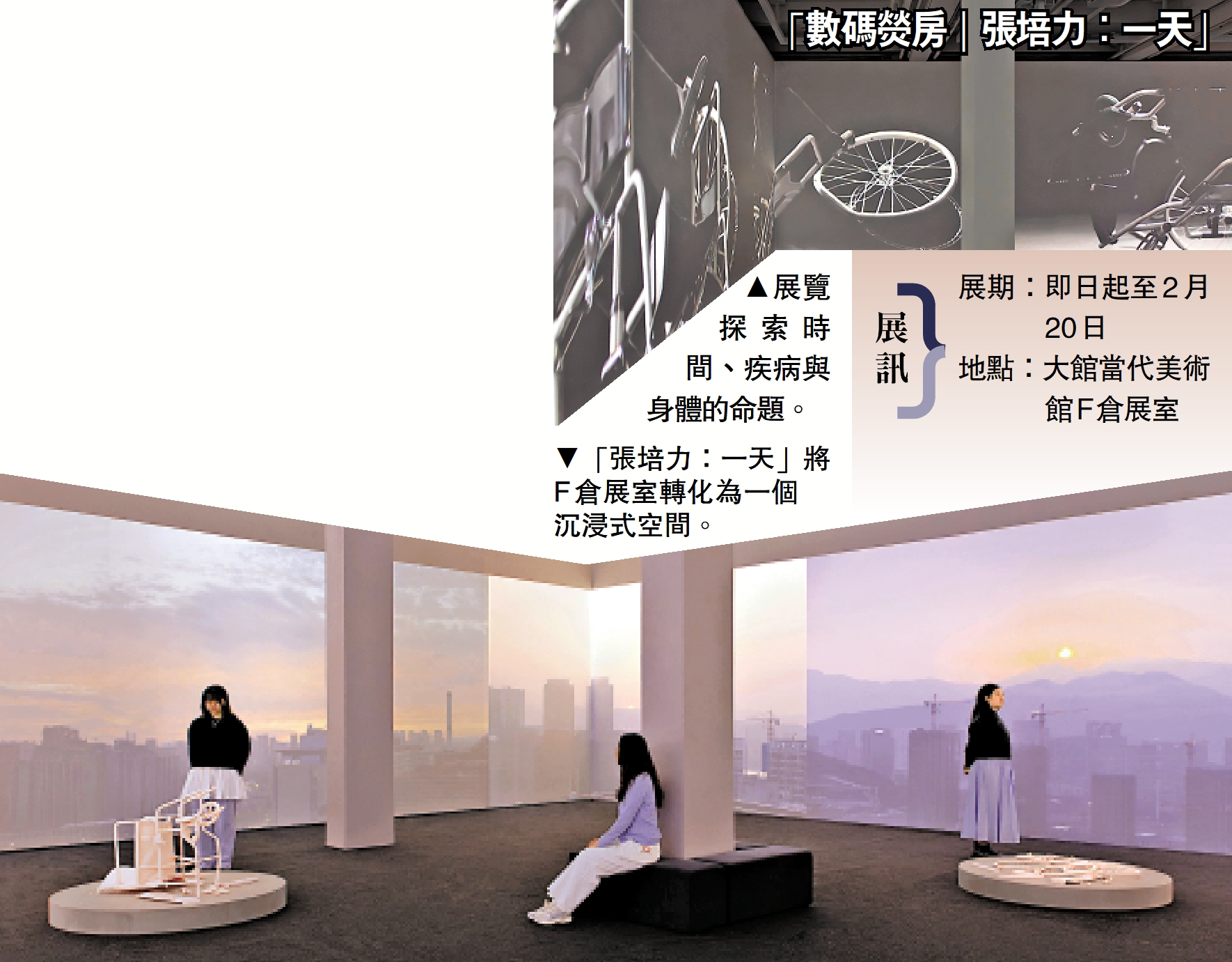 【大公報訊】大館當代美術館即日起至2月20日在F倉展室呈獻全新數碼藝術展覽「數碼熒房|張培力:一天」,由大館副策展人王姝曼策展。是次展覽將帶來藝術家張培力全新委約創作的同名八頻道錄像裝置,探索時間、疾病與身體的命題,透過不同媒介技術製造出新的現實,帶領觀眾在大館的古蹟建築裏穿梭於日常的公共與私人空間,體驗時空的交織與間離。