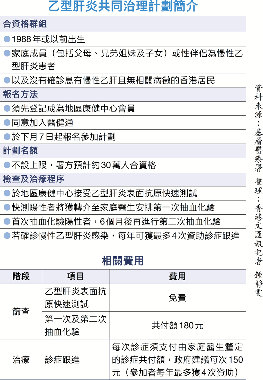 香港文匯報訊(記者 鍾靜雯)醫務衞生局轄下基層醫療署昨日宣布,下月7日起正式推出「乙型肝炎共同治理計劃」,及早識別社區中的慢性乙型肝炎患者並長期跟進,以減低他們出現肝硬化和肝癌等嚴重併發症的風險。1988年或之前出生,父母、兄弟姐妹、子女或性伴侶是慢性乙型肝炎患者,以及沒有確診患有慢性乙肝且無相關病徵的香港居民,合資格參與該計劃,能獲政府資助接受乙肝的風險評估與篩查,確診者每年可獲最多4次資助診症跟進,政府建議每次共付額150元,料有30萬人合資格。