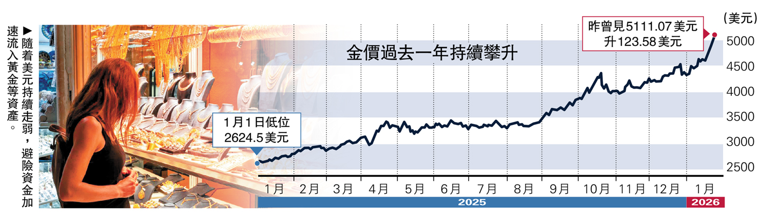 【大公報訊】金價周一首次突破每盎司5000美元關口,盤中一度觸及5111美元,單日升幅達2.5%。年初至今,金價已累計上漲近18%,主要受美國政策調整及全球資金持續從主權債券轉向貴金屬推動。美銀預計,金價在今年春季有望升至6000美元。