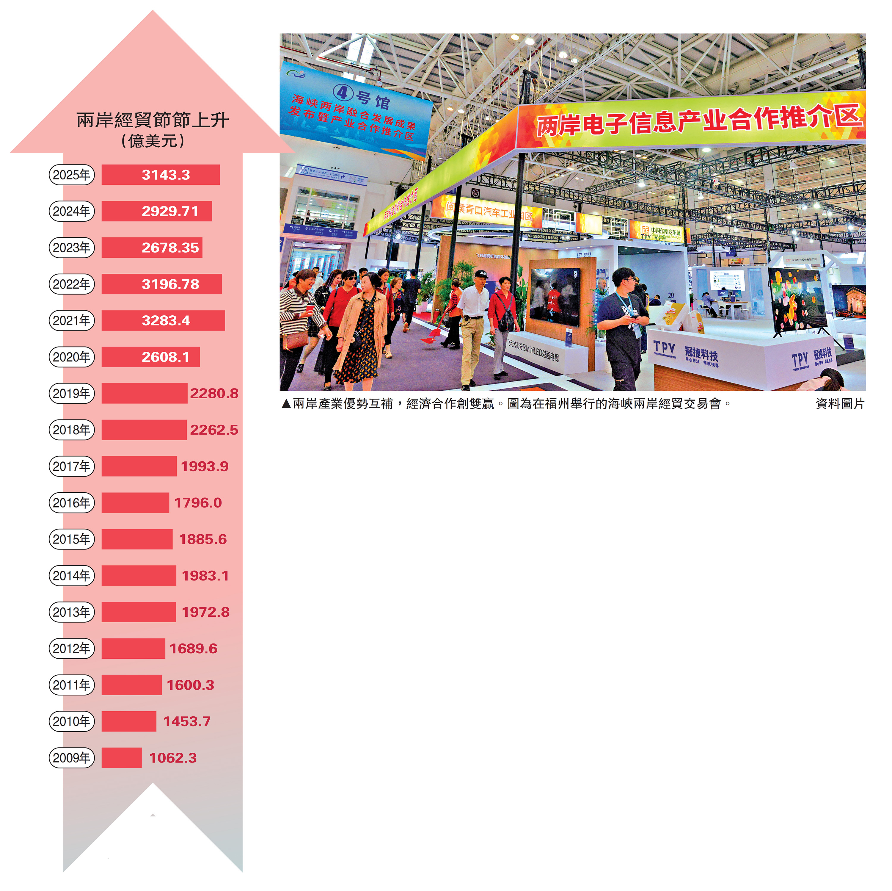 【大公報訊】據中新社報道:在全球貿易增速放緩、台海局勢緊張的背景下,兩岸經貿數據依然亮眼。據海關總署統計,2025年兩岸貿易總額達3143.3億美元,其中大陸對台灣出口增長11.2%,大陸自台灣進口增長6.0%。