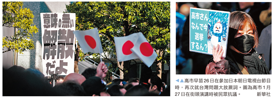 高市此前宣布解散眾議院,提前舉行大選。眾議院選舉1月27日發布公告,將在2月8日進行投計票。高市還放話說,若執政聯盟未獲半數席位,將辭任首相。有日媒質疑,高市動用解散權,是為了自身黨派利益和謀求政治優勢。
