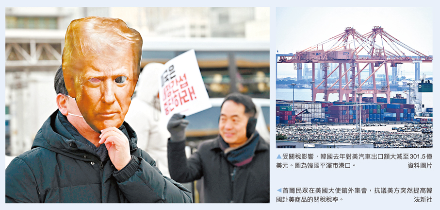 香港文匯報訊 美國總統特朗普周一(1月26日)突然宣布,美方將提高對韓國商品徵收關稅稅率,包括汽車、木材、製藥產品及所有「對等關稅」項目稅率,將從15%增至25%,報復韓國國會尚未批准韓國與美國達成的貿易協議。特朗普突然加碼關稅令韓國當局震驚,韓總統府表示暫未收到美方正式通報,推測其與韓國停滯的3,500億美元(約2.7萬億港元)對美投資法案有關,會提請國會加快審議。