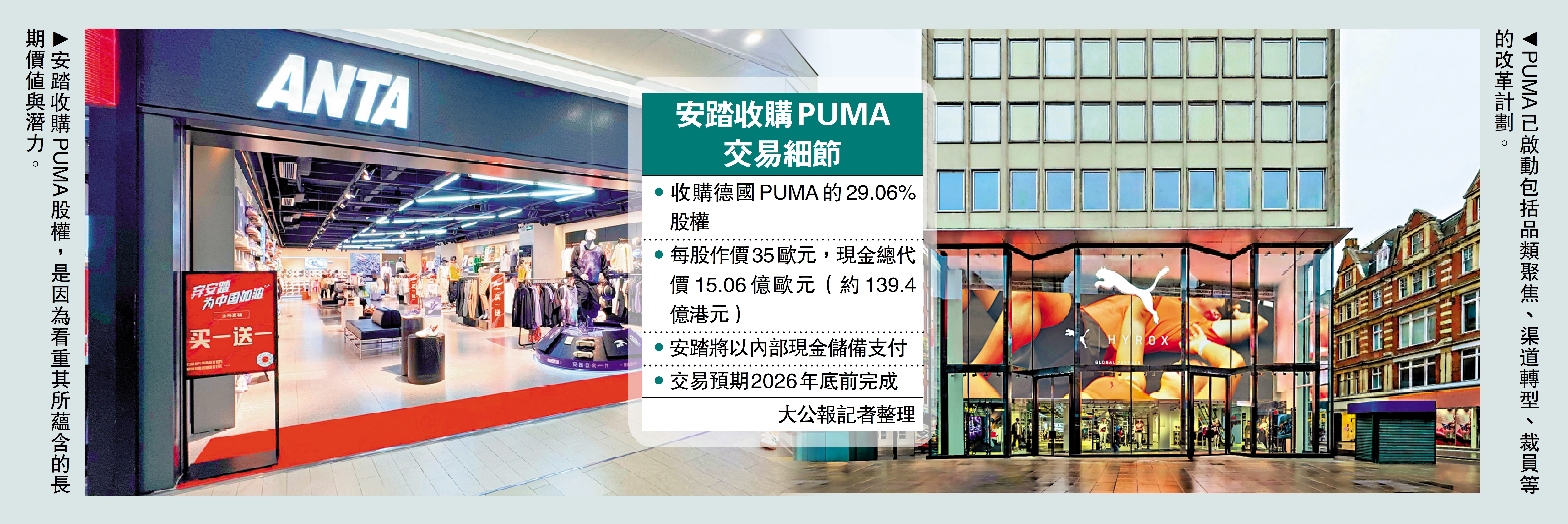 近年積極進行收購的安踏體育(02020)宣布,與法國皮諾家族旗下Artemis訂立購股協議,落實收購德國PUMA的29.06%股權,涉資15.06億歐元(約139.4億港元),成為單一大股東。對價將以安踏內部現金儲備支付,這安排可消除或以股權融資而稀釋股東回報的市場憂慮。安踏股價昨日一度飆高3.4%至78.95元高位,收市報77.9元,升幅逾2%。/大公報記者 李潔儀