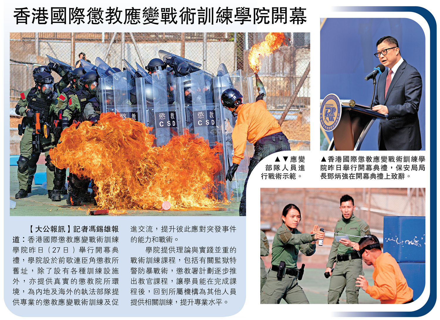 【大公報訊】記者馮錫雄報道:香港國際懲教應變戰術訓練學院昨日(27日)舉行開幕典禮,學院設於前歌連臣角懲教所舊址,除了設有各種訓練設施外,亦提供真實的懲教院所環境,為內地及海外的執法部隊提供專業的懲教應變戰術訓練及促進交流,提升彼此應對突發事件的能力和戰術。