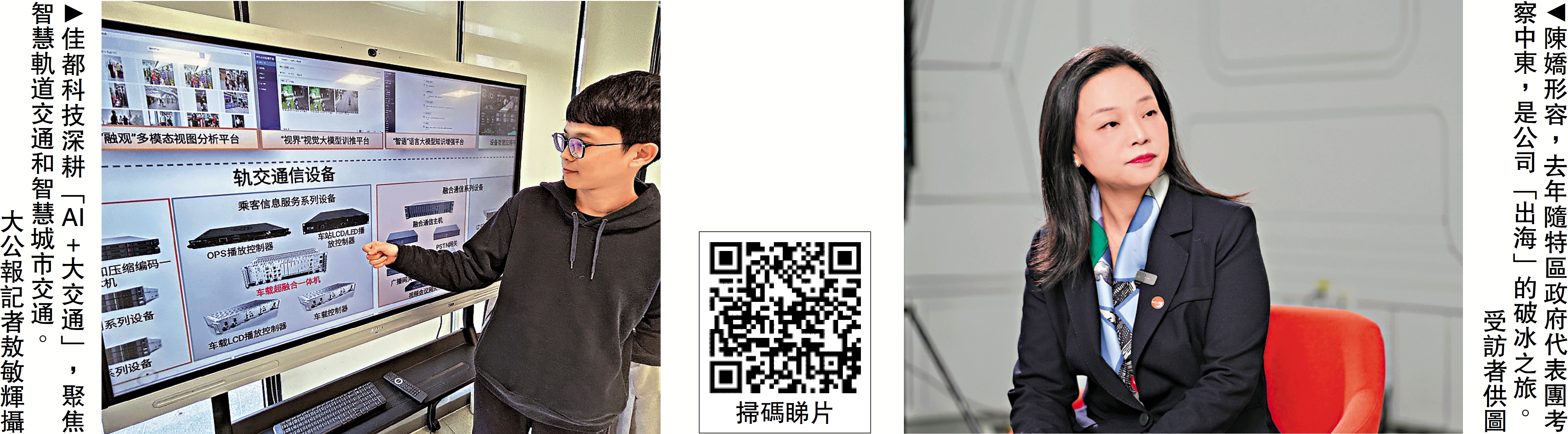 去年5月,佳都科技集團董事長兼執行總裁陳嬌隨香港特區政府代表團考察中東,在她看來,這是佳都科技「出海」的破冰之旅,實現了「雙對接」——既對接了中東市場的真實需求,也對接了香港作為「超級聯繫人」的全方位支持體系。如今,在香港投資推廣署的協助和香港撐企系列政策支持下,佳都科技已落戶香港科學園,啟動面向香港本土和海外的研發和市場化工作。接下來,借助香港的獨特優勢,佳都科技將加速推進AI智慧交通、城市治理等解決方案在中東、東南亞等海外市場的落地,將中國智慧化方案推向更廣闊的市場。/大公報記者 敖敏輝廣州報道