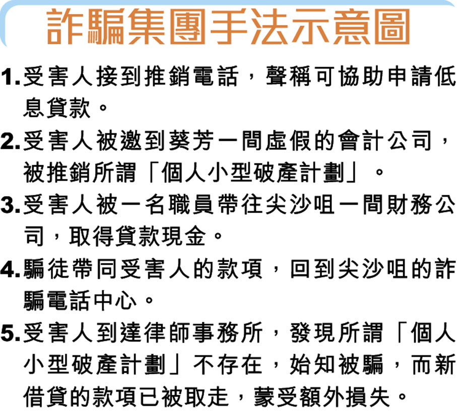 新界南總區高級警司(刑事)姚永勤昨日表示,警方去年接獲4名受害人報案指,接獲聲稱可協助申請低息貸款的推銷電話後,獲邀到葵芳一間訛稱為會計公司的辦事處,被兩名職員推銷「個人小型破產計劃」,申請該計劃的人士即使債台高築,也能透過申請無懲罰性的破產甩身,無需償還債項。其後職員會帶事主到一間位於尖沙咀的財務公司以高達47%年利率借貸,借款由3.8萬至17萬元不等。受害人取得貸款後,職員隨即以收取「轉介手續費」名義取走款項。