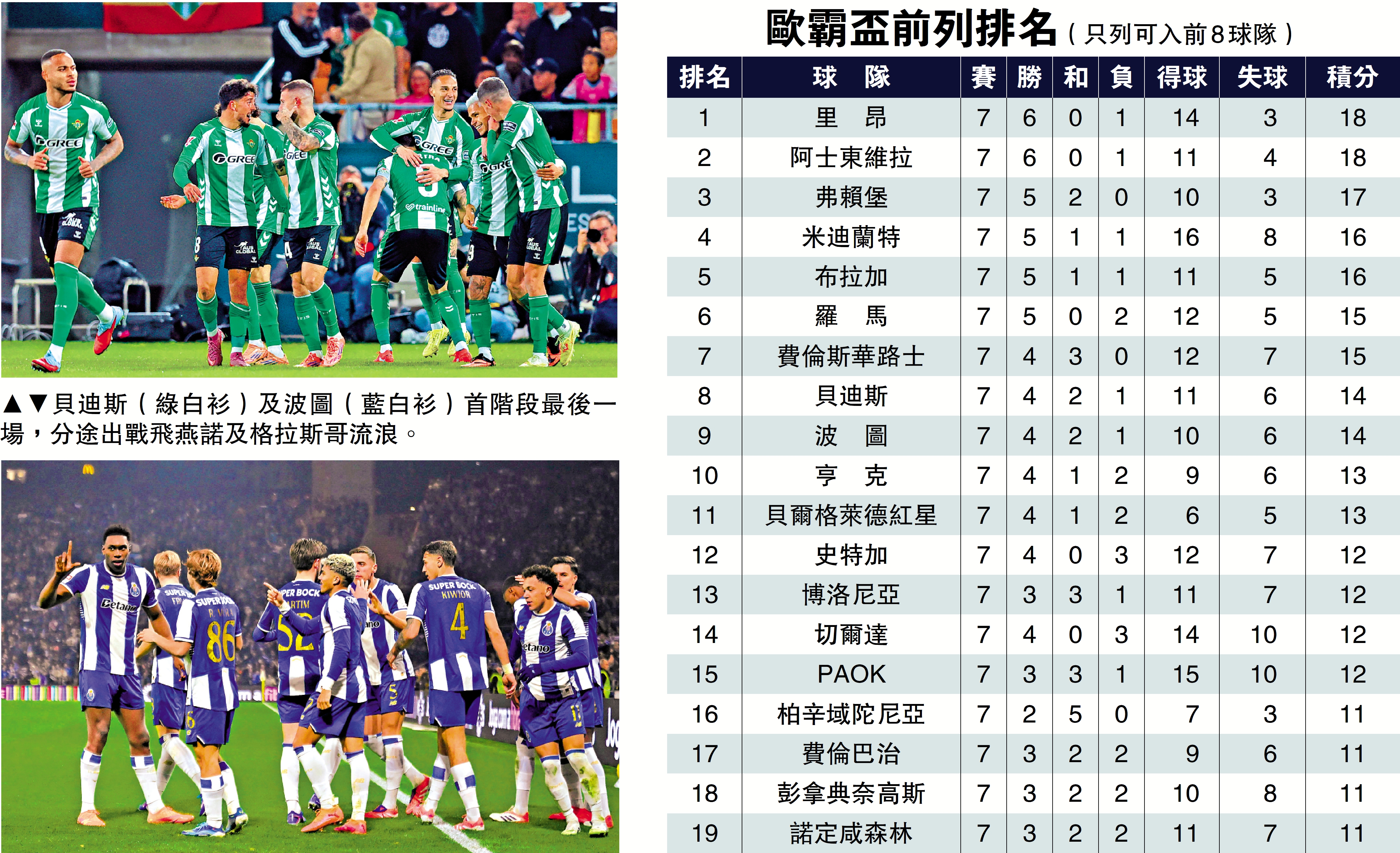 【大公報訊】歐霸盃明天凌晨4時舉行首階段最後一輪賽事,兩支爭取以前8身份直入16強的球隊波圖及貝迪斯,分別於主場迎戰格拉斯哥流浪及飛燕諾。目前排名第9的波圖要直接晉級必須爭上更高排名,幸好他們的對手是已經篤定出局的流浪,可望藉對手失去鬥心大獲全勝;排名第8的貝迪斯與波圖同積14分,對手卻是仍有望晉級的飛燕諾,焗攻之下隨時迎來入球大戰。