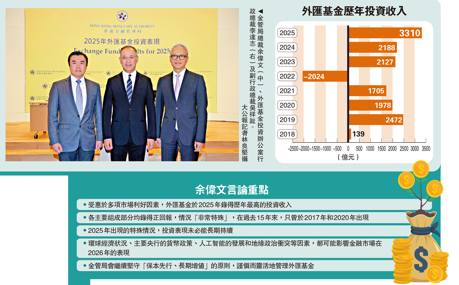投資市場在2025年受惠於多項利好因素,帶動外匯基金也錄得強勁表現。金管局公布,外匯基金去年錄得投資收入3310億元,以金額計是歷來最高,也是首次超越3000億元大關。金管局總裁余偉文表示,各主要組成部分去年均錄得正回報,「非常特殊」。今年投資環境複雜多變,當局會作防禦性部署。\大公報記者 黃裕慶