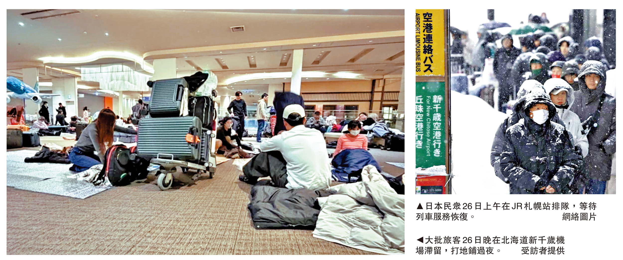日本北海道札幌市近日遭創紀錄暴雪侵襲,導致JR等交通服務嚴重受阻,新千歲機場連續多日出現大規模旅客滯留。日媒報道稱,25日晚新千歲機場約有7000名旅客滯留,26日晚仍有2000名旅客在機場過夜,現場情況堪稱「災難級別」。中國遊客莫小姐28日向大公報記者表示,原本想去日本度假,結果卻淪為「難民」,困在機場搶便利店食物,打地鋪過夜,體驗很糟糕。\大公報記者 桂茹雲