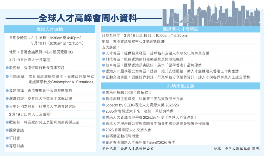 香港人才服務辦公室昨日公布,「全球人才高峰會周」將於今年3月18日及19日在香港會議展覽中心舉行,另有9項人力資源和人才發展的衛星活動,包括招聘會、交流會及嘉年華等在多個場地舉行。今屆高峰會主要包括「國際人才論壇」和「機遇匯人才博覽展」兩大活動,其中人才論壇邀請2010年的諾貝爾經濟學獎得主來港進行主題演講,並凝聚全球的政商學界領袖,聚焦教育、科技與人才一體化發展,促進區域人才交流,展示多元發展機遇,探索未來人才趨勢。