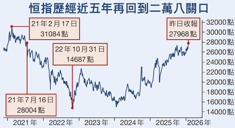美聯儲議息會議宣布維持息率不變,符合市場預期,在金價再創新高及北水回流帶動氣氛下,港股昨日於期指結算日造好,盤中更一度升穿28,000點大關,高見28,056點,是2021年7月中以來首次,全日收升141點,收報27,968點,見逾4年半高位。港股已經連升7個交易日,累升1,481點。分析指出, 美聯儲對經濟向好的判斷,將支持環球股市表現,港股近期受惠傳統板塊帶動,同時相信中資科技股的利潤率回升能力將成為未來主導港股市場繼續跑贏的一大重要因素。 ●香港文匯報記者 周紹基