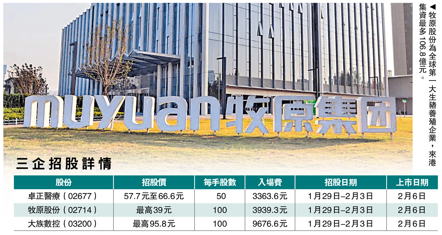 本港新股(IPO)市場繼續維持強勁態勢,「A+H」股上市尤其活躍,除本周初開始招股的東鵬飲料(09980)及國恩科技(02768)認購反應熱烈外,昨日再有三隻新股招股,包括卓正醫療(02677)、牧原股份(02714)、大族數控(03200),入場費分別為3363.6、3939.3和9676.6元。其中,牧原股份集資規模最大,多達106.8億元。\大公報記者 麥晉瑋