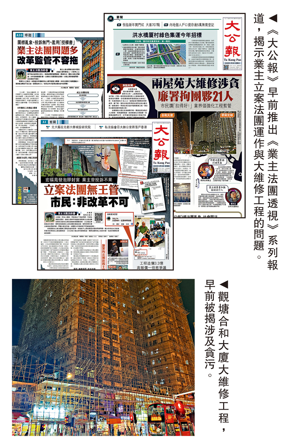 《大公報》早前推出「業主法團透視」系列報道,揭示業主立案法團在運作與大維修工程中存在的問題,特別是圍標、不透明的會議流程及外判亂象,並透過個案分析和成功經驗分享,探討制度缺陷及提出政策改革建議。報道引發社會廣泛回響,同時呼籲政府改革《建築物管理條例》,優化監管刻不容緩。\大公報記者 伍軒沛