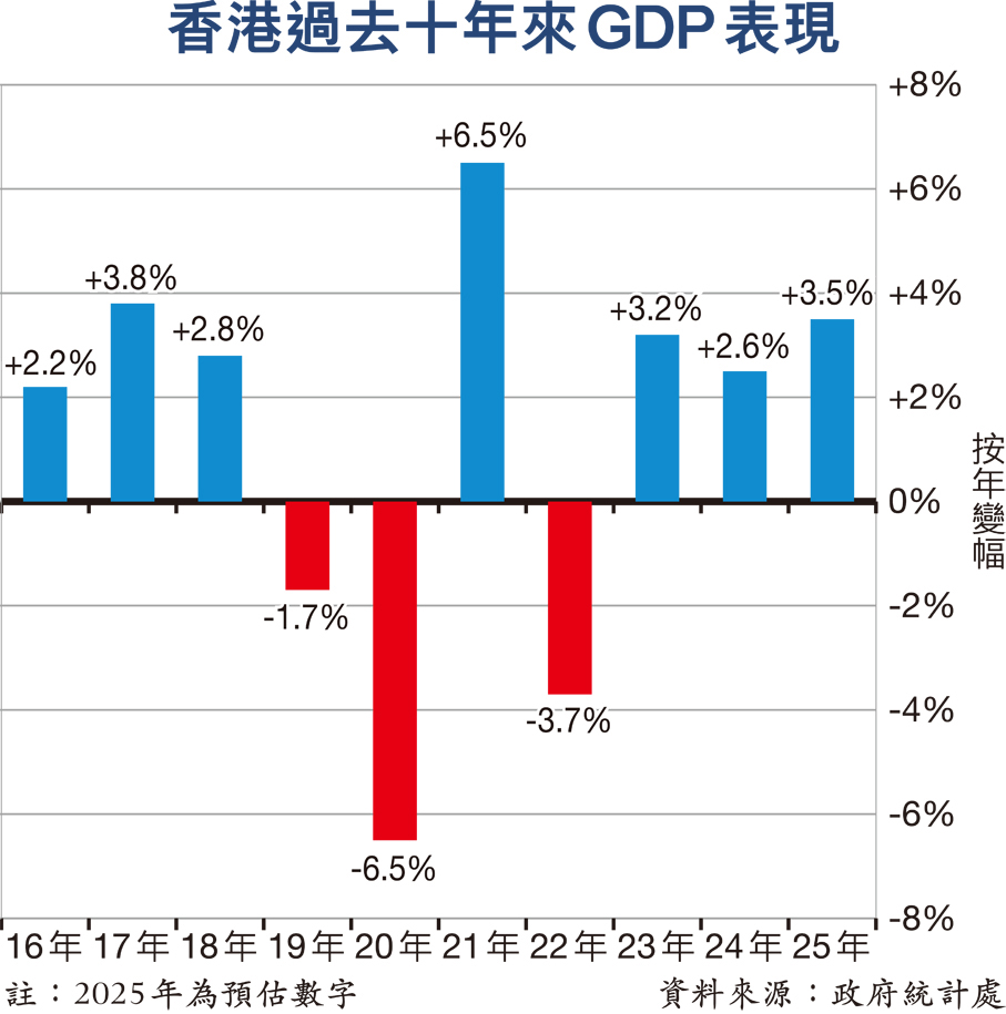 受惠出口強勁反彈、投資顯著增長、消費市道回穩,三頭馬車並駕齊驅下,香港經濟增長步伐加快。特區政府統計處昨日公布預估數字,本港去年全年GDP實質增長3.5%,連續3年擴張,增速不單較2024年的2.6%加快,更超越政府此前上調至3.2%預測。尤其去年第四季出口與投資數據均表現「標青」,帶動去年第四季GDP按年升3.8%,優於市場預期,亦較去年第三季3.7%升幅輕微加快,反映經濟復甦動力進一步鞏固。政府發言人昨表示,在外部需求回穩及本地經濟活動復甦支持下,本港經濟今年有望保持良好增長勢頭。有分析看好樓市今年有望反彈約5%,或帶動本港今年經濟增長維持較高水平。