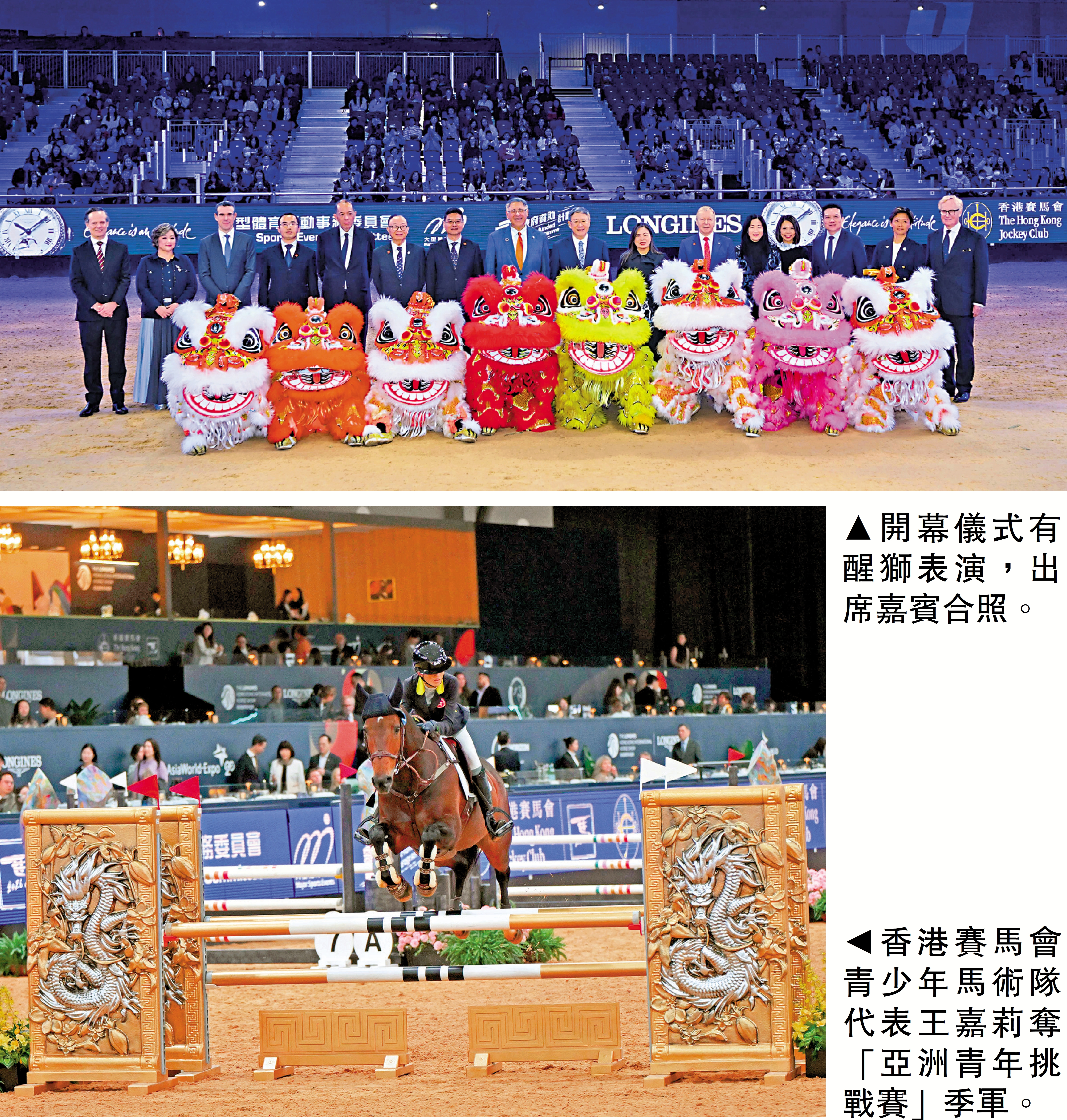 開幕儀式上,近日於國際馬聯亞洲錦標賽勇奪獎牌的中國香港馬術隊成員,以及殘疾人馬術隊成員一同亮相,接受全場祝賀。馬會馬術隊成員賴楨敏和黎嘉怡,將代表中國香港參與盛典期間的部分賽事。