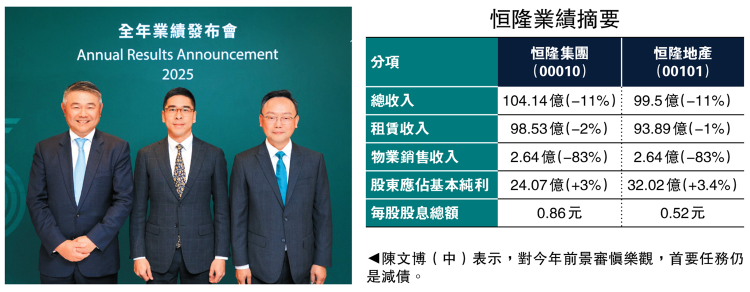 陳文博表示,恒隆2025年業績有輕微V形進步,下半年的表現較上半年為佳,而且今年亦有較好的開始,整體市況回穩,公司亦不再強調「保本保命」,但仍要採取較保守態度,認為負債存在一定風險,集團會優先減債,暫時不會進取投地,對今年市況謹慎樂觀。