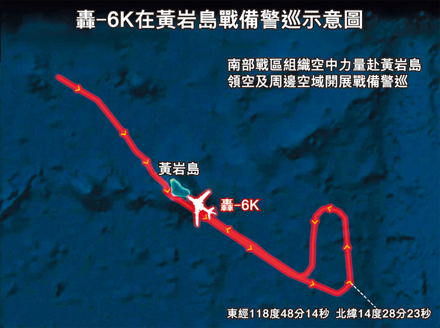央視媒體「玉淵譚天」當天發布的軍機巡航示意圖顯示,南部戰區轟-6K轟炸機、殲擊機組成編隊飛抵黃岩島空域後,沿東南方向空域巡航。
