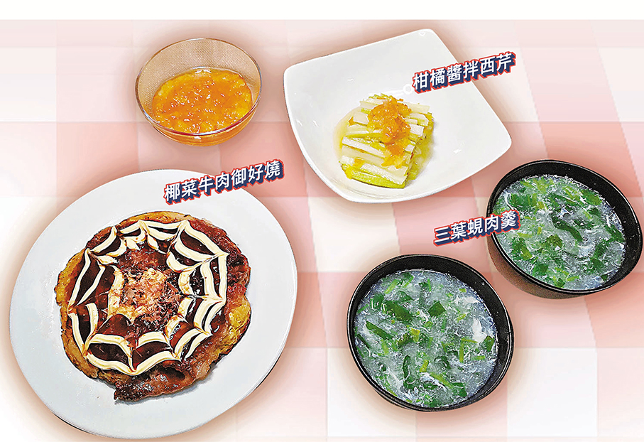 立春對應的五味是酸味,少量酸味有助於疏肝解鬱、促進消化,是春季的理想選擇。立春飲食重點在養肝明目:西芹能助肝氣升發,搭配柑橘獨特的香味促進脾胃運作,能將冬季潛伏於體內的病邪宣洩出去,達到紓肝理氣及排毒的效果﹔椰菜益腸胃,高纖維含量有助腸道健康;牛肉甘溫入脾,製成御好燒是一道健脾和胃的養生料理。三葉的清香能促進食慾並幫助氣血流通;蜆肉可寧神補血,特別適合春季以排毒、抗病毒為養生目標的人士。