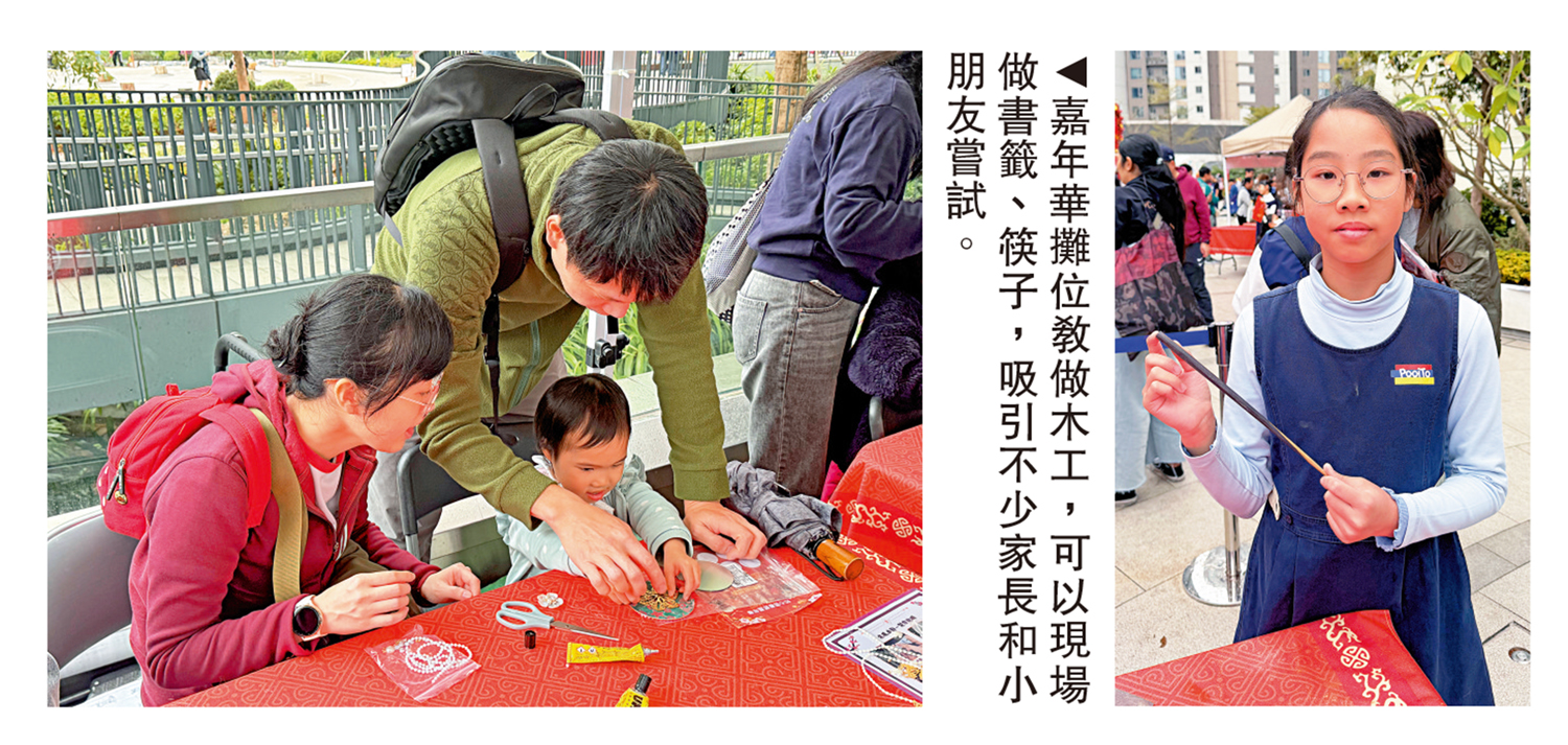 春節嘉年華有學校開設攤位教做木工,可以現場做書籤、筷子,吸引不少家長和小朋友到場嘗試。有小朋友表示親身體驗後,感受到傳統技藝的魅力和不易。