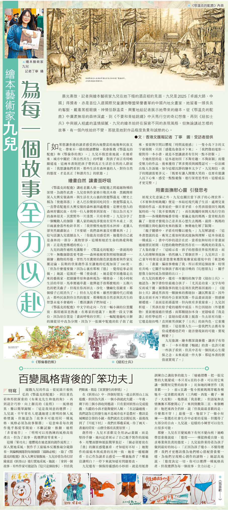 晨光熹微,記者與繪本藝術家九兒在她下榻的酒店相約見面,九兒是2025「卓越大師·中國」得獎者,亦是首位入選國際兒童讀物聯盟榮譽書單的中國內地女畫家,她留着一頭長長的鬈髮,戴着黑框眼鏡,神情恬靜溫柔,興奮地給記者展示她帶來的繪本。從《鄂溫克的駝鹿》中廣袤無垠的森林深處,到《不要和青蛙跳繩》中天馬行空的奇幻想像,再到《紐扣士兵》中與親人相處的溫情細膩,九兒的繪本始終在探索不同的表現風格,但無論講述怎樣的故事,有一個內核始終不變,那就是她對作品極度負責和誠懇的心。