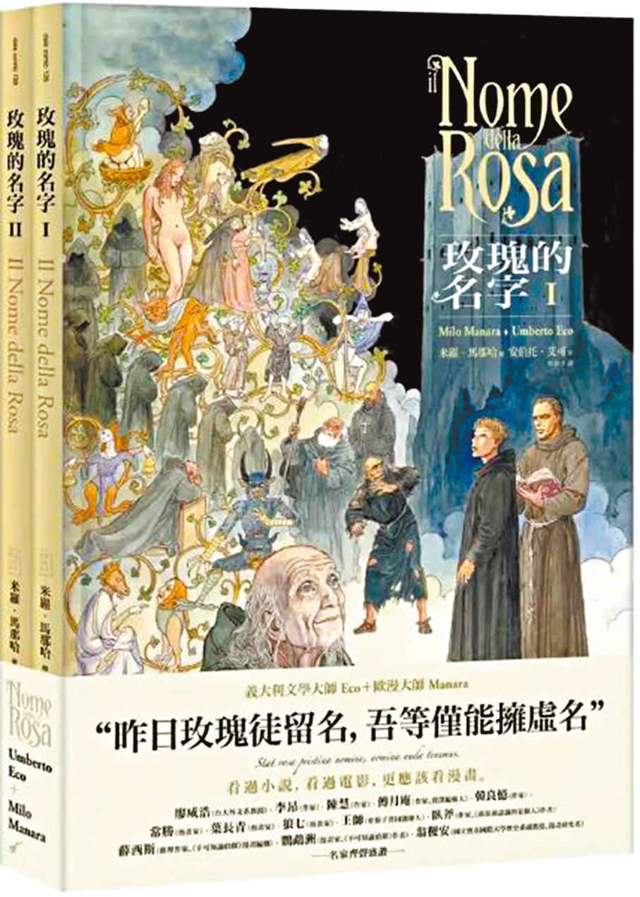 享譽國際的符號學家安伯托·艾可的著名小說《玫瑰的名字》,在出版50年後,由意大利漫畫大師馬那哈執筆,以漫畫版呈現。艾可的故事發生在14世紀的一座古老修道院內,他用了很多篇幅來描述這個巨大、可怕、令人印象深刻的建築,馬那哈則繪出十分壯闊的山勢、修道院,以及各個人物的特寫、表情、服飾等,並且由他的女兒西蒙娜上色。書中的色彩運用既有趣又令人回味,深色、灰色和濃密的色彩,形成了鮮明的對比。