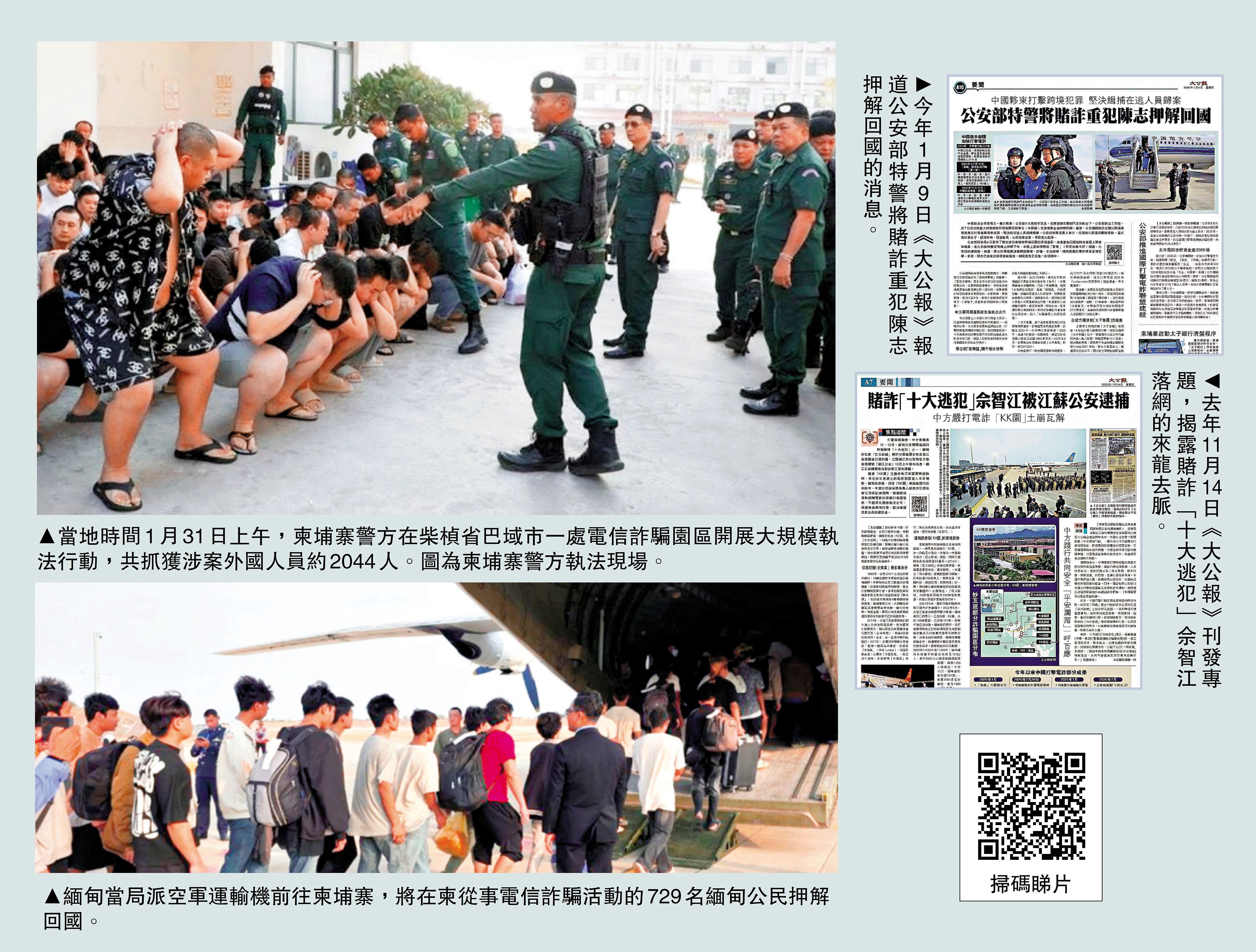 據內地媒體援引柬埔寨方面消息,柬警方於當地時間1月31日上午在一處電信詐騙園區開展大規模執法行動,共抓獲涉案外籍人員約2044人,涉及中國、越南、印度、緬甸、尼泊爾等多個國家。這是柬埔寨近期在全國範圍內清剿電詐犯罪中規模最大的一次。與此同時,緬甸國內也同步加大打擊電詐力度,其中僅一次行動即逮捕221名中國籍嫌犯。內地專家向《大公報》表示,跨境電詐嚴重威脅中國公民財產安全與海外利益,中國始終堅定支持並深度參與區域聯合打擊行動,推動構建高效協同的國際反詐合作機制。\大公報記者 趙一存