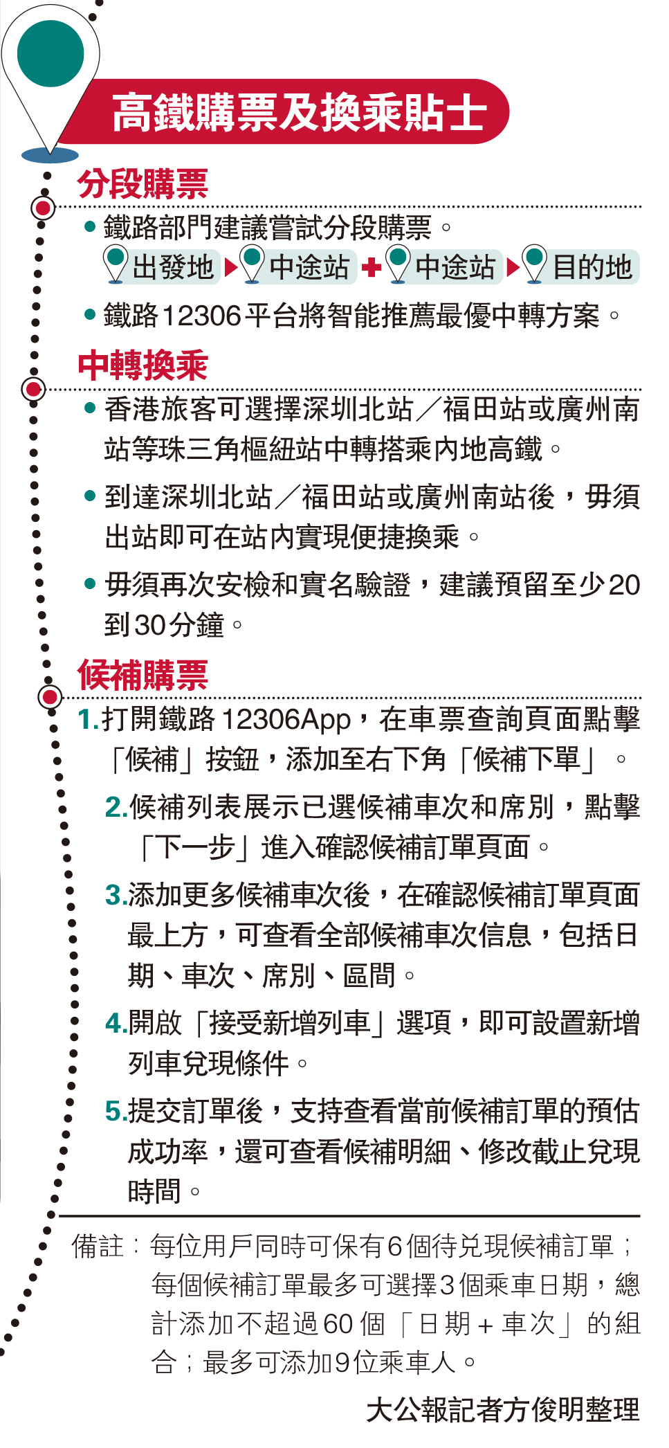 •香港旅客可選擇深圳北站/福田站或廣州南站等珠三角樞紐站中轉搭乘內地高鐵。
