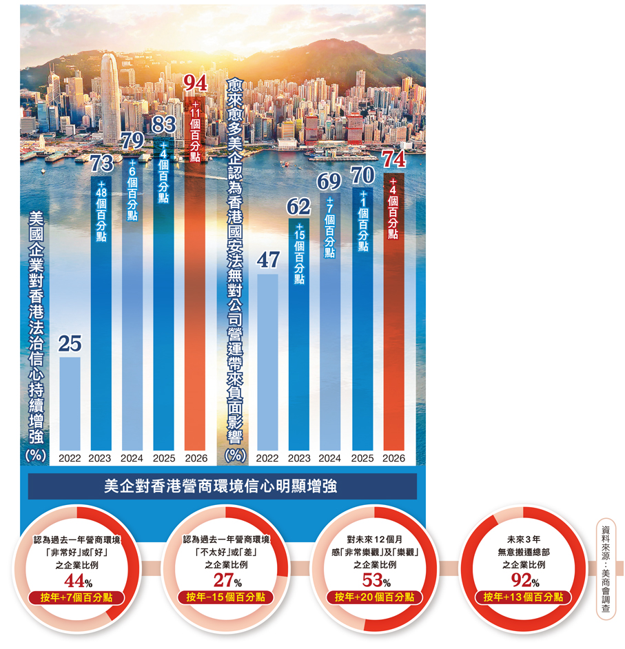 香港國安法壓艙穩舵逾5年以來,充分發揮「壓艙石」與「定海神針」作用,令社會迅速回復安定秩序,營商環境持續優化。多項數據清晰反映,「香港故事」對外資的吸引力有增無減。香港美國商會昨日發布《2026年商業情緒調查結果報告》顯示,有94%美企對香港法治投下「信任票」,較2025年83%再大幅增加11個百分點,創調查以來最高紀錄。同時,有74%美企表示公司營運並未受到香港國安法帶來負面影響,此比例是連續第4年攀升,今年再升4個百分點。這一趨勢有力證明,香港國安法實施後,本港法治體系在國際企業視野中維持高度可預測與公正,成為鞏固整體營商信心的堅實基石。