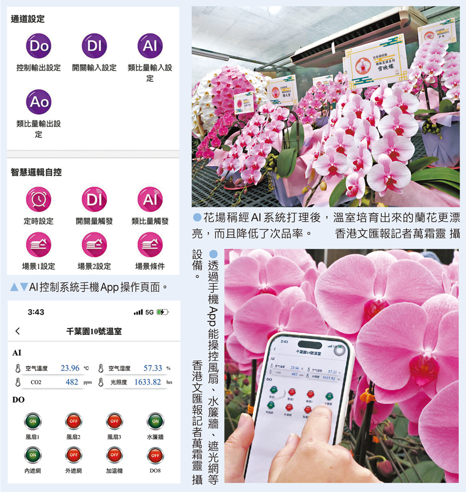 每逢農曆新年臨近,不少市民都會購買年花求個好意頭,原來這項傳統的「指定動作」背後,近年已悄悄加入人工智能(AI)技術,以更好地把關年花品質,有利大眾將好意頭迎接回家。新一代蘭花才子、千葉園負責人楊尹俊於2024年引入AI技術打理溫室花場,以更精準控制培育日本蘭花的溫度、濕度與光照等。香港文匯報直擊香港花場發現,經AI打理並培育出來的蘭花不但能有效降低次品比率,整體質素更有明顯提升。楊尹俊分享道,這些「AI蘭花」深受顧客歡迎,今年推出的20多個款式中,已有5個款式在農曆新年前一個月售罄。