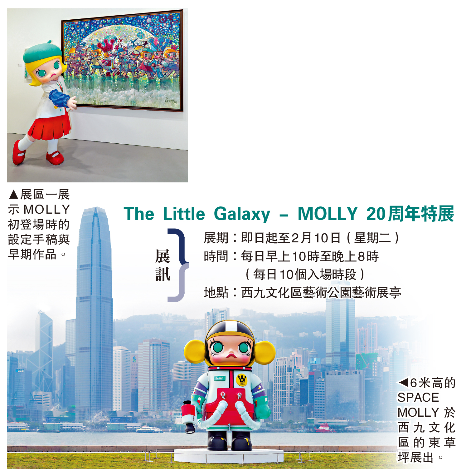 為讓更多人感受到MOLLY的魅力,展覽期間6米高的SPACE MOLLY於西九文化區的東草坪與大家會面,身後配上香港得天獨厚的天際線,成為不可錯過的打卡景點。