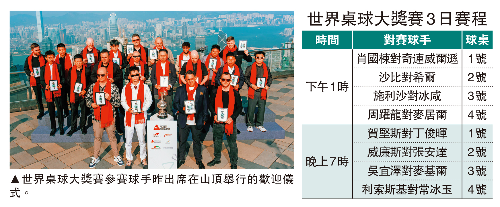 【大公報訊】世界桌球大獎賽3日在啟德體育園體藝館揭開戰幔,包括7屆世界冠軍奧蘇利雲、世界排名第一的卓林普、力爭衛冕冠軍的羅拔遜等世界前三十二位球手來港參賽。主辦方日前宣布,因應德國大師賽最新賽程,部分球手需要更新行程,包括原定羅拔遜對陣積克鍾斯的32強揭幕戰改為4日下午1時舉行,取而代之的是肖國棟對陣奇連威爾遜。