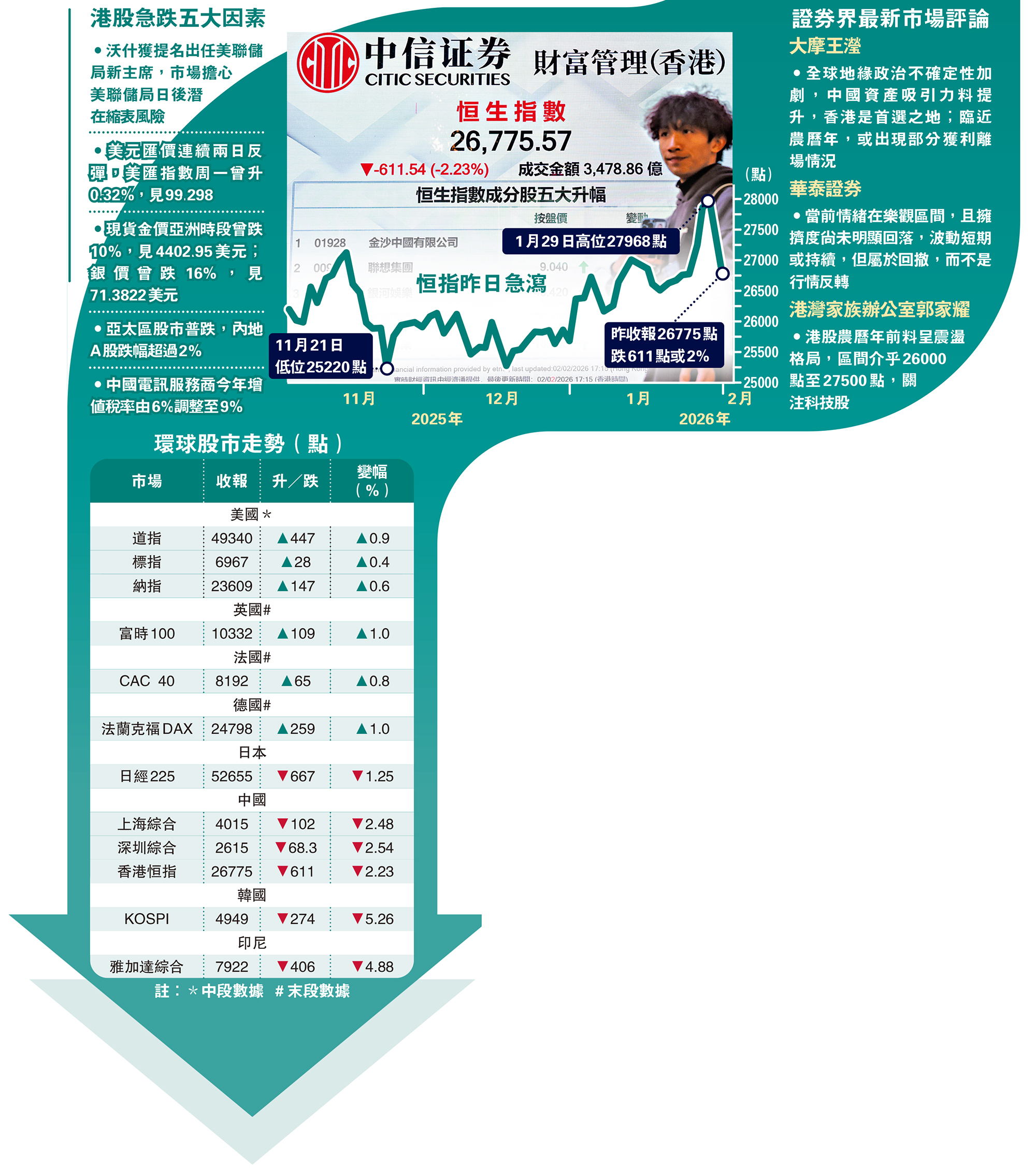 美元匯價反彈,風險資產遭遇拋售,現貨金價昨日在亞洲時段一度插水10%。港股低走,恒指昨日收市回吐611點。大摩中國首席股票策略師王瀅表示,臨近農曆新年,部分資金或選擇獲利離場;但全球地緣政治不確定性加劇,料可提升中國資產吸引力,而香港是首選市場。華泰證券認為,港股今次回調更多是上漲過快後的技術性調整,催化港股行情的三個因素仍然存在。港股外圍見反彈,ADR升近300點至27057點,夜期高見27062點。\大公報記者 劉鑛豪