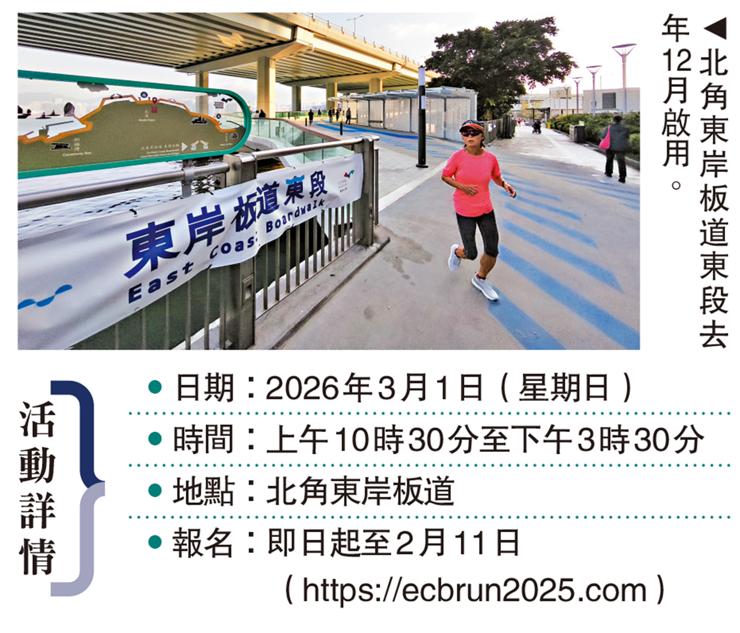 北角東岸板道東段去年12月正式啟用,發展局海港辦事處及海濱事務委員會將於3月1日在北角東岸板道舉辦「暢踏西東板道跑」,昨日(2月2日)起免費開放予公眾於網上報名。