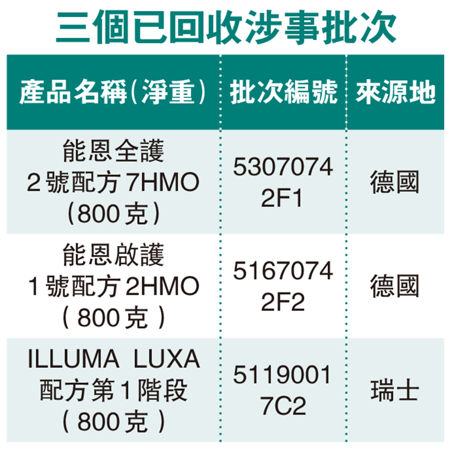 【大公報訊】記者程進報道:雀巢香港早前回收22個批次的嬰幼兒配方奶粉,原因是部分原材料可能受蠟樣芽孢桿菌污染。食安中心昨日表示,經持續跟進調查,有5個樣本被檢出微量蠟樣芽孢桿菌的耐熱毒素,當中每公斤食物含介乎0.2至1.3微克的蠟樣芽孢桿菌的耐熱毒素。所有驗出毒素的樣本,均來自雀巢香港早前已公布回收的22個批次之內,當中涉及3款產品(見表)。