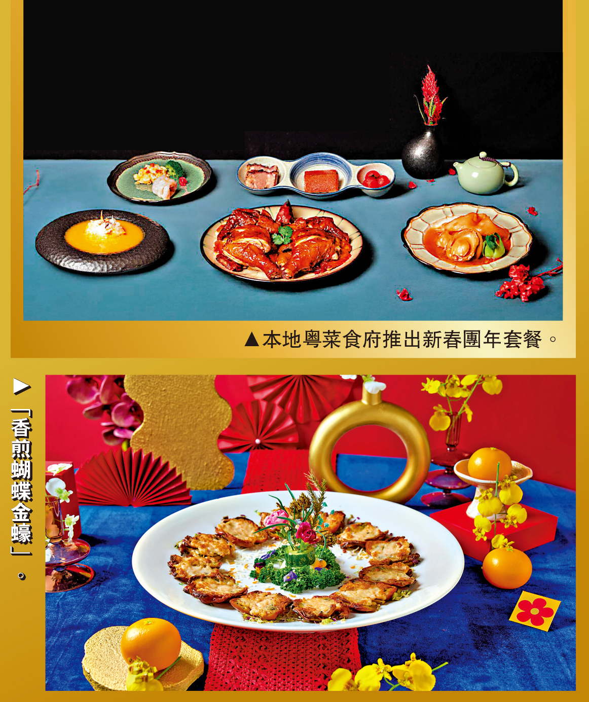 粵菜食府逸東軒四位用新春團年套餐包括:逸東燒味薈萃蜜汁叉燒、話梅車厘茄和脆皮乳豬件、金湯海皇燴燕窩、蟹皇芙蓉蝦球,主菜有十頭鮑魚扣花膠、清蒸東星斑及鴻運脆皮雞,以及瑤柱松子蛋白炒飯、紅棗雪耳燉萬壽果和香芒糯米卷伴擂沙湯圓。