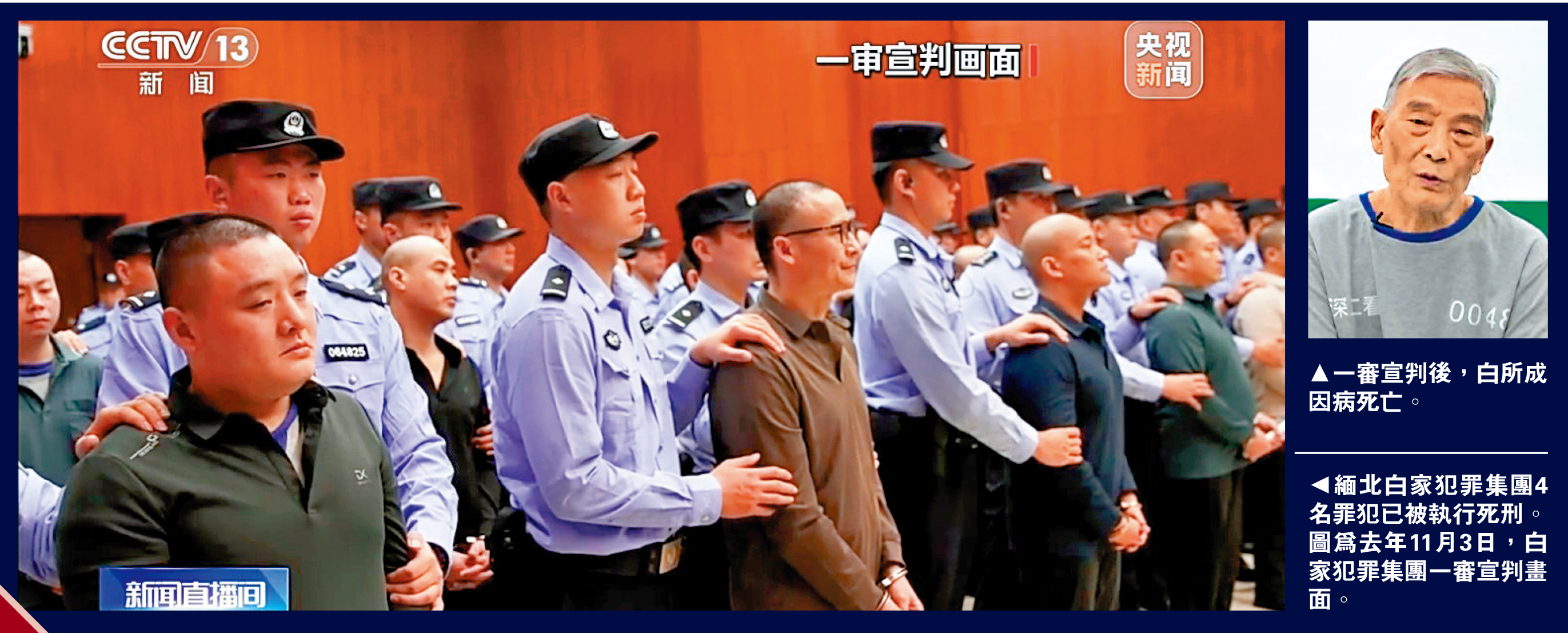 據介紹,2025年11月3日,白所成、白應蒼、楊立強、胡小姜、陳廣益等5名被告人以故意殺人、故意傷害、詐騙、販賣、製造毒品、綁架、開設賭場等罪,一審被判處死刑,並判處相應附加刑。