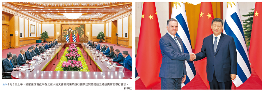 香港文匯報訊 據新華社報道,2月3日上午,國家主席習近平在北京人民大會堂同來華進行國事訪問的烏拉圭總統奧爾西舉行會談。習近平指出,中方始終重視中拉關係,支持拉美和加勒比國家維護自身主權、安全、發展利益,願同烏方和地區國家推動共建中拉命運共同體走深走實。
