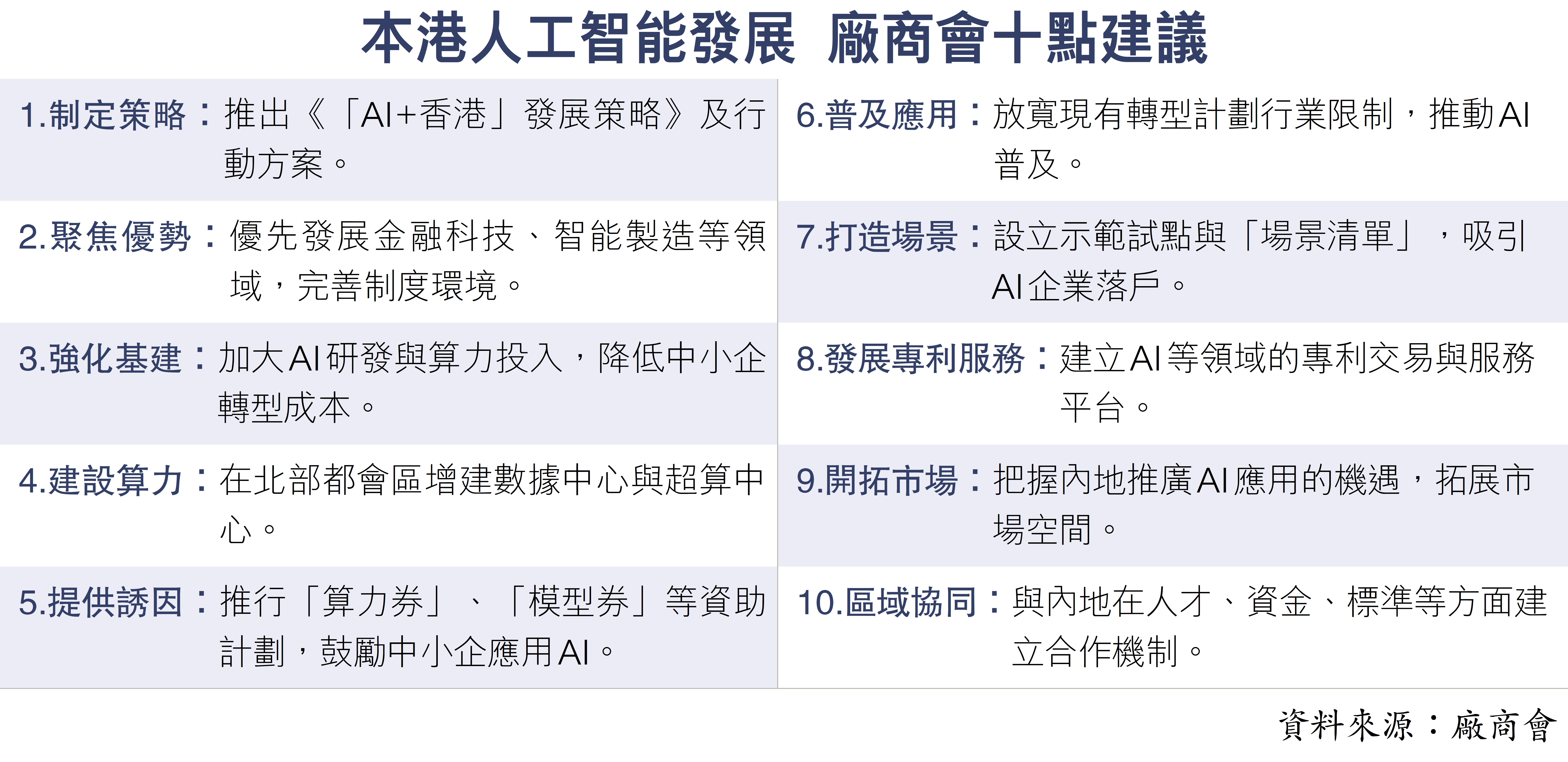 廠商會認為,香港可參考《意見》的政策精神以及借鑑內地一些領先省市在人工智能賦能製造業高質量發展方面的實踐經驗,並就推動本地人工智能發展提出10點建議,包括盡快出台具前瞻性和系統性的《「AI+香港」發展策略》來引導AI及相關產業的發展、率先聚焦金融科技、智能供應鏈、科研中試、先進製造、生物醫健、國際語言模型等優勢領域進行布局以及加大投入,強化AI技術研發與算力基建,以降低中小企智能轉型門檻等。