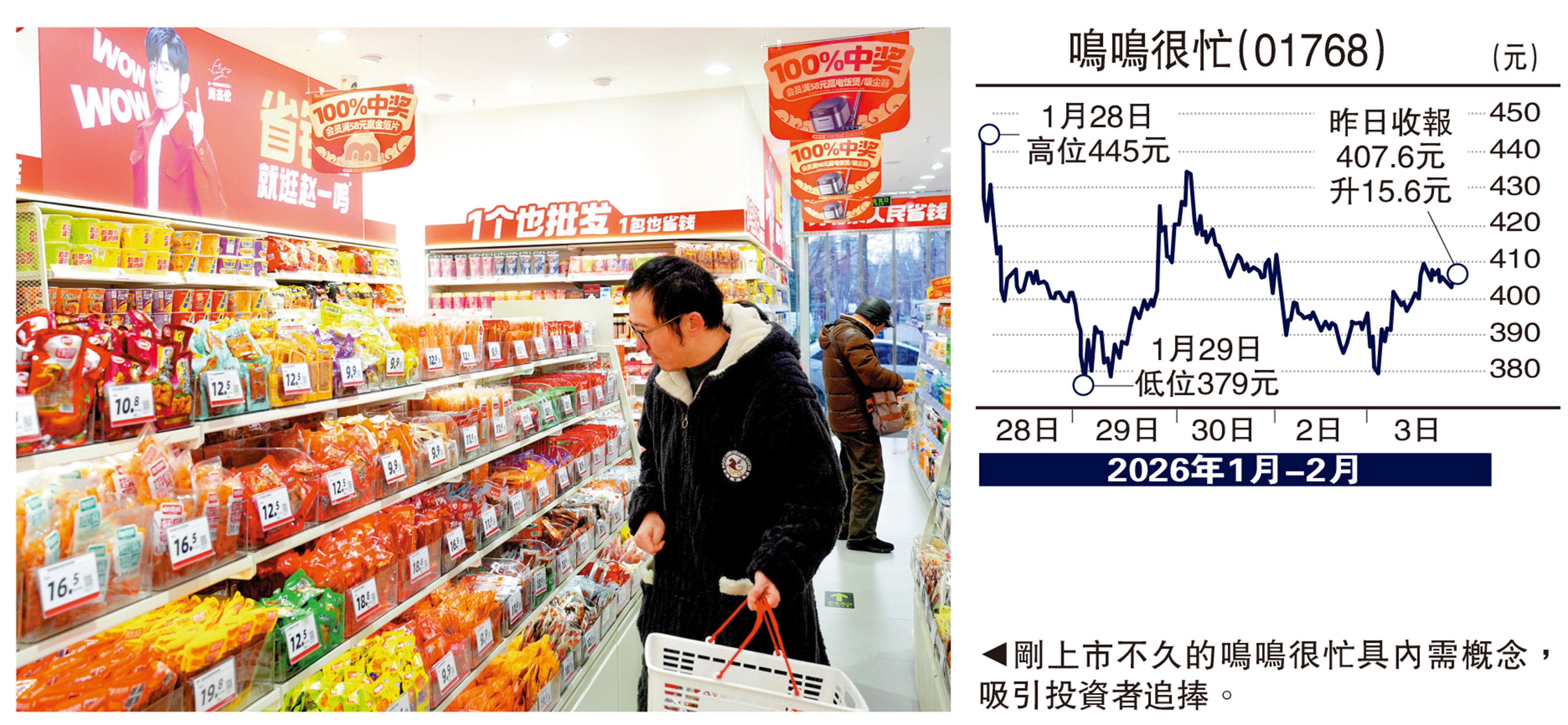 近日中國零食集團鳴鳴很忙(01768)在港上市,市場反應不俗,吸引淡馬錫、貝萊德、富達及騰訊作為基石投資者,首日上市升69%,昨日股價衝上400元以上水平,可見內外投資者繼續押注看好中國內需消費持續發力。去年中國消費品零售同比增長3.7%,比2024年加快0.2個百分點,預期今年增幅進一步提升。