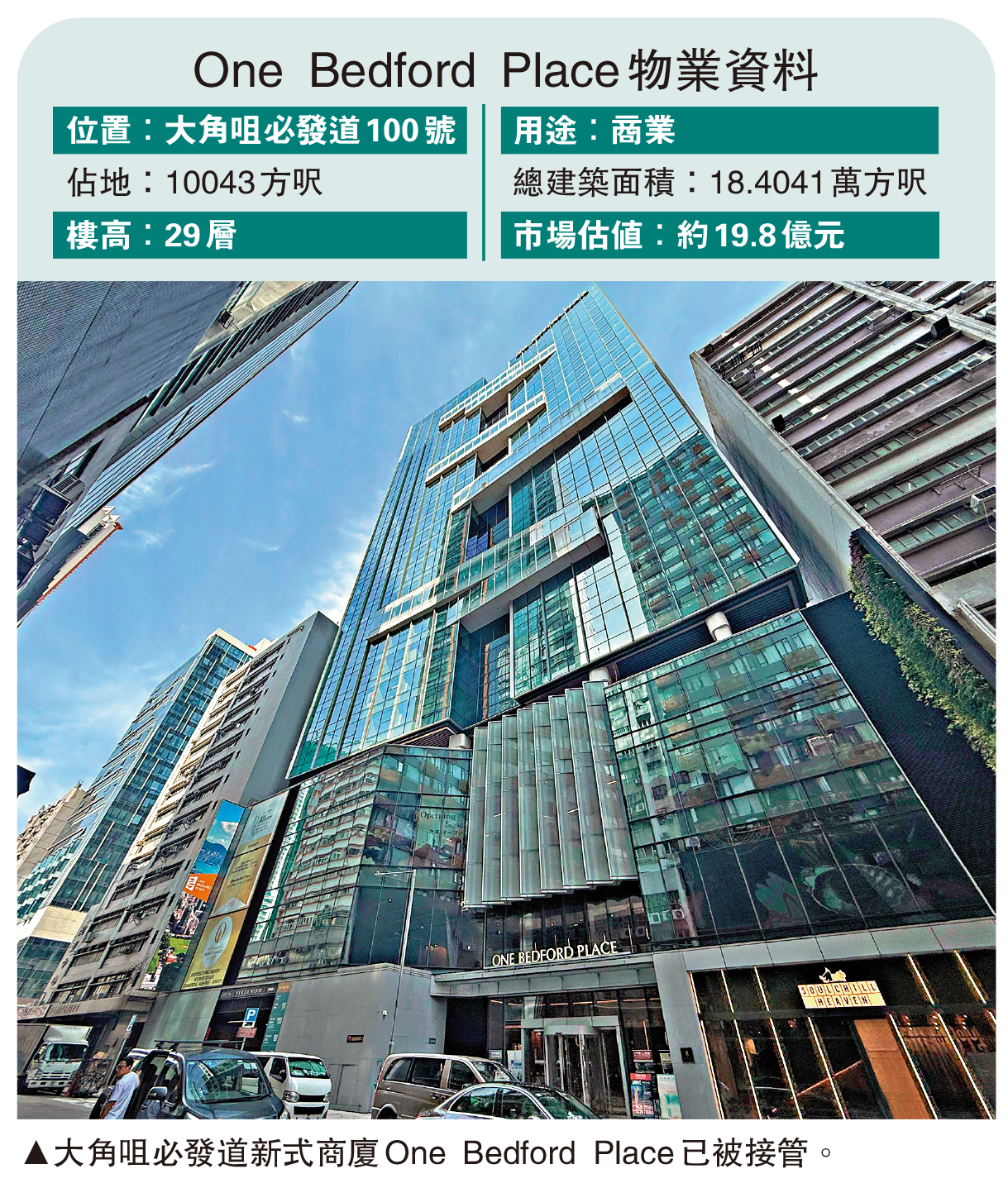 一直以集結「民間資金」形式經營的樂風集團,在過去十年積極增加土儲,以「輕資產」模式開發至少8個住宅及商業項目,惟最終疑因融資問題出現第一滴血,損手物業屬於去年轉售為租的大角咀必發道全新商廈One Bedford Place,最近已淪銀主盤,接管人新近委託測量師行推出招標,屬該集團首個項目淪銀主貨。市場消息指出,項目估值約19.8億元。\大公報記者 林惠芳